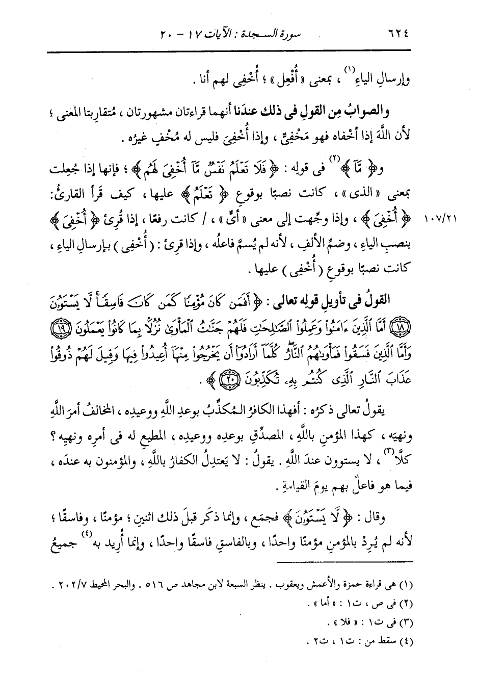§الْقَوْلُ فِي تَأْوِيلِ قَوْلِهِ تَعَالَى: {أَفَمَنْ كَانَ مُؤْمِنًا كَمَنْ كَانَ فَاسِقًا لَا يَسْتَوُونَ} [السجدة: 18] يَقُولُ تَعَالَى ذِكْرُهُ: أَفَهَذَا الْكَافِرُ الْمُكَذِّبُ بِوَعْدِ اللَّهِ وَوَعِيدِهِ، الْمُخَالِفُ أَمْرَ اللَّهِ وَنَهْيَهُ، كَهَذَا الْمُؤْمِنِ بِاللَّهِ، الْمُصَدِّقِ بِوَعْدِهِ وَوَعِيدِهِ، الْمُطِيعِ لَهُ فِي أَمْرِهِ وَنَهْيِهِ؟ كَلَّا لَا يَسْتَوونَ عِنْدَ اللَّهِ. يَقُولُ: لَا يَعْتَدِلُ الْكُفَّارُ بِاللَّهِ وَالْمُؤْمِنُونَ بِهِ عِنْدَهُ فِيمَا هُوَ فَاعِلٌ بِهِمْ يَوْمَ الْقِيَامَةِ. وَقَالَ: {لَا يَسْتَوُونَ} [التوبة: 19] فَجَمَعَ، وَإِنَّمَا ذَكَرَ قَبْلَ ذَلِكَ اثْنَيْنِ: مُؤْمِنًا، وَفَاسِقًا، لِأَنَّهُ لَمْ يُرِدْ بِالْمُؤْمِنِ مُؤْمِنًا وَاحِدًا، وَبِالْفَاسِقِ فَاسِقًا وَاحِدًا، وَإِنَّمَا أُرِيدَ بِهِ جَمِيعُ -[625]- الْفُسَّاقِ، وَجَمِيعُ الْمُؤْمِنِينَ بِاللَّهِ. فَإِذَا كَانَ الِاثْنَانِ غَيْرَ مَصْمُودٌ لَهُمَا، ذَهَبَتْ بِهِمَا الْعَرَبُ مَذْهَبَ الْجَمْعِ. وَذُكِرَ أَنَّ هَذِهِ الْآيَةَ نَزَلَتْ فِي عَلِيِّ بْنِ أَبِي طَالِبٍ رِضْوَانُ اللَّهِ عَلَيْهِ، وَالْوَلِيدِ بْنِ عُقْبَةَ.