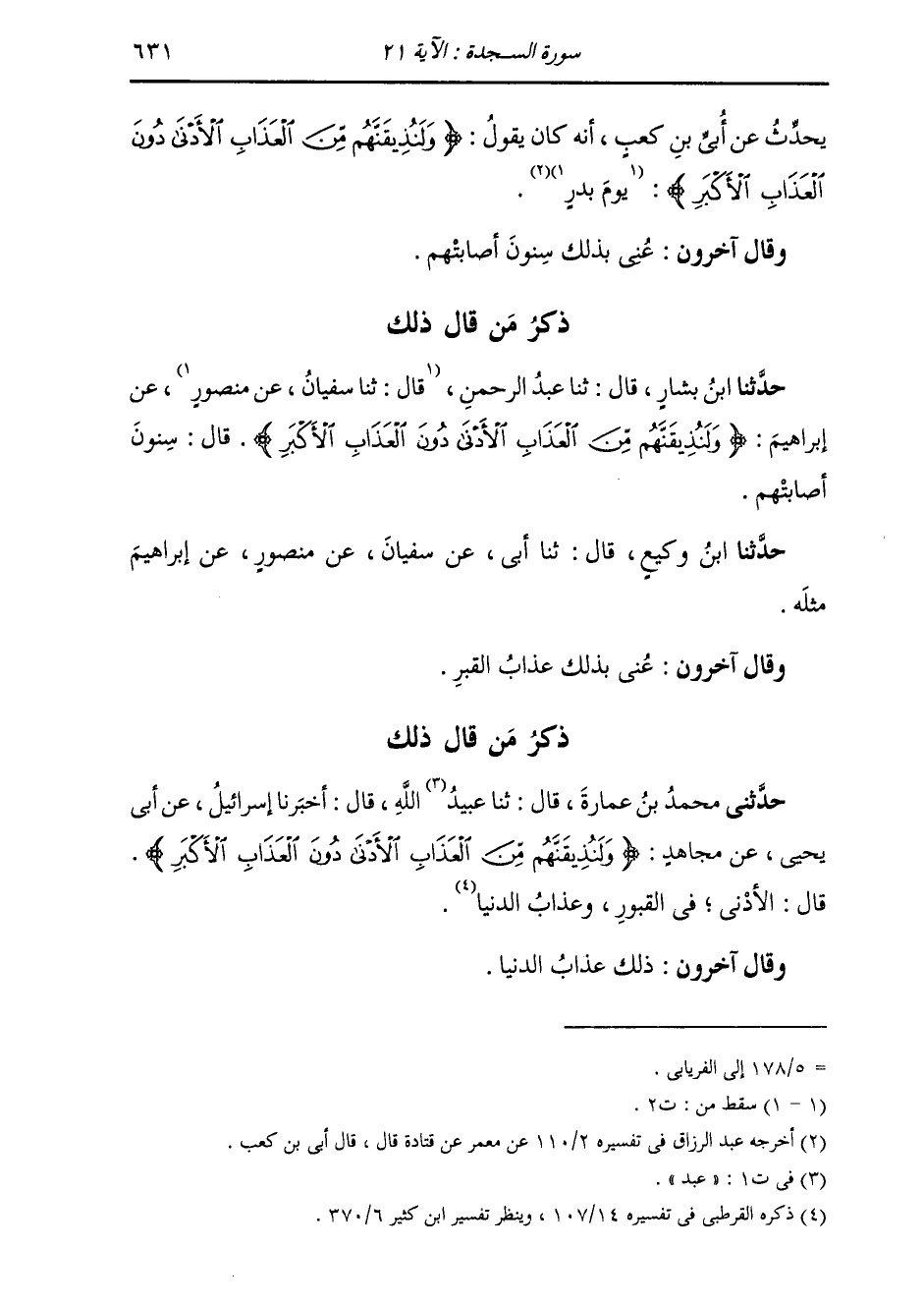 ذِكْرُ مَنْ قَالَ ذَلِكَ: حَدَّثَنَا ابْنُ بَشَّارٍ، قَالَ: ثنا عَبْدُ الرَّحْمَنِ، قَالَ: ثنا سُفْيَانُ، عَنْ مَنْصُورٍ، عَنْ إِبْرَاهِيمَ، " {§وَلَنُذِيقَنَّهُمْ مِنَ الْعَذَابِ الْأَدْنَى دُونَ الْعَذَابِ الْأَكْبَرِ} [السجدة: 21] قَالَ: سِنُونٌ أَصَابَتْهُمْ ". حَدَّثَنَا ابْنُ وَكِيعٍ قَالَ: ثنا أَبِي، عَنْ سُفْيَانَ، عَنْ مَنْصُورٍ، عَنْ إِبْرَاهِيمَ مِثْلَهُ. وَقَالَ آخَرُونَ: عَنَى بِذَلِكَ عَذَابَ الْقَبْرِ.