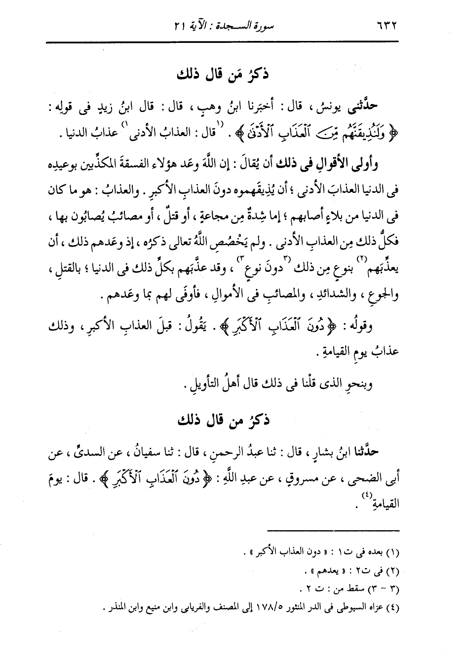 ذِكْرُ مَنْ قَالَ ذَلِكَ: حَدَّثَنَا ابْنُ بَشَّارٍ، قَالَ: ثنا عَبْدُ الرَّحْمَنِ، قَالَ: ثنا سُفْيَانُ، عَنِ السُّدِّيِّ، عَنْ أَبِي الضُّحَى، عَنْ مَسْرُوقٍ، عَنْ عَبْدِ اللَّهِ، " {§دُونَ الْعَذَابِ الْأَكْبَرِ} [السجدة: 21] قَالَ: يَوْمَ الْقِيَامَةِ ". -[633]- حَدَّثَنَا ابْنُ بَشَّارٍ قَالَ: ثنا عَبْدُ الرَّحْمَنِ قَالَ: ثنا إِسْرَائِيلُ، عَنِ السُّدِّيِّ، عَنْ مَسْرُوقٍ، عَنْ عَبْدِ اللَّهِ مِثْلَهُ