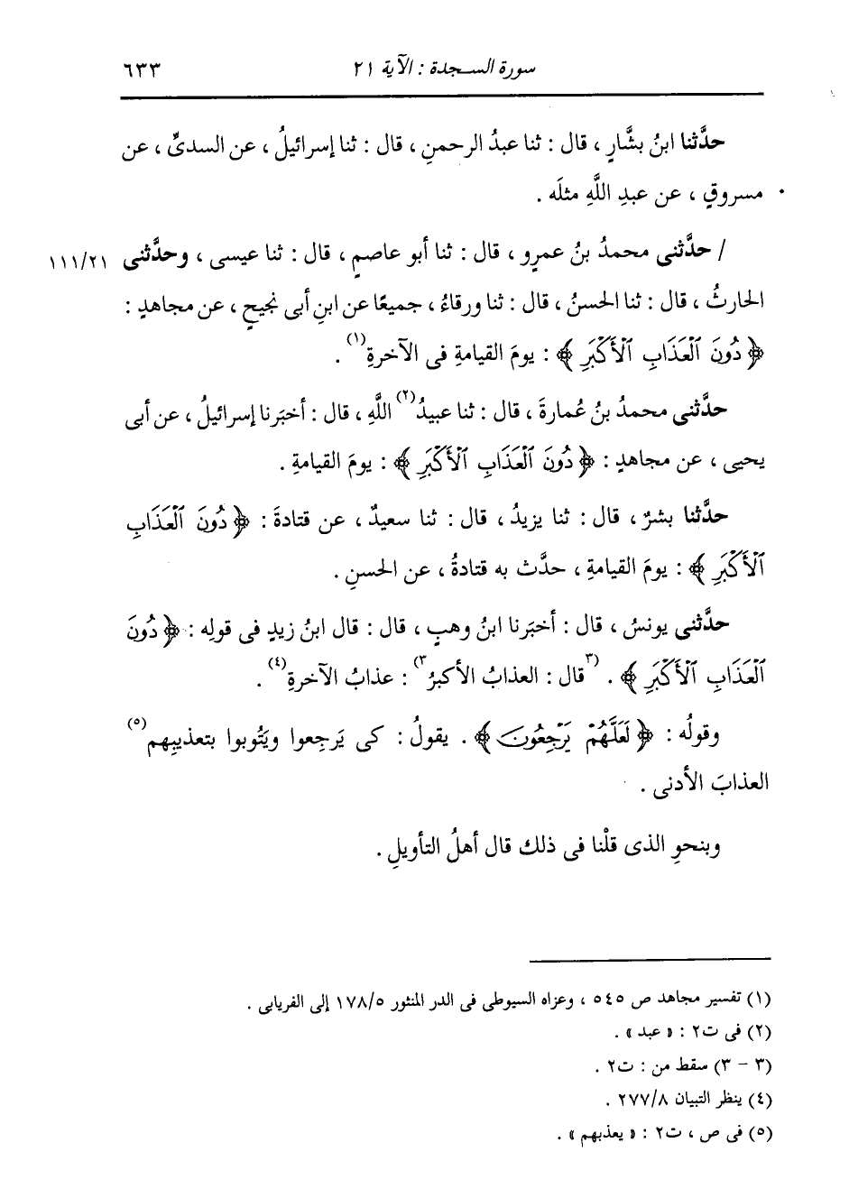 حَدَّثَنِي مُحَمَّدُ بْنُ عَمْرٍو، قَالَ: ثنا أَبُو عَاصِمٍ، قَالَ: ثنا عِيسَى، وَحَدَّثَنِي الْحَارِثُ، قَالَ: ثنا الْحَسَنُ، قَالَ: ثنا وَرْقَاءُ، جَمِيعًا، عَنِ ابْنِ أَبِي نَجِيحٍ، عَنْ مُجَاهِدٍ، " {§دُونَ الْعَذَابِ الْأَكْبَرِ} [السجدة: 21] يَوْمَ الْقِيَامَةِ فِي الْآخِرَةِ "