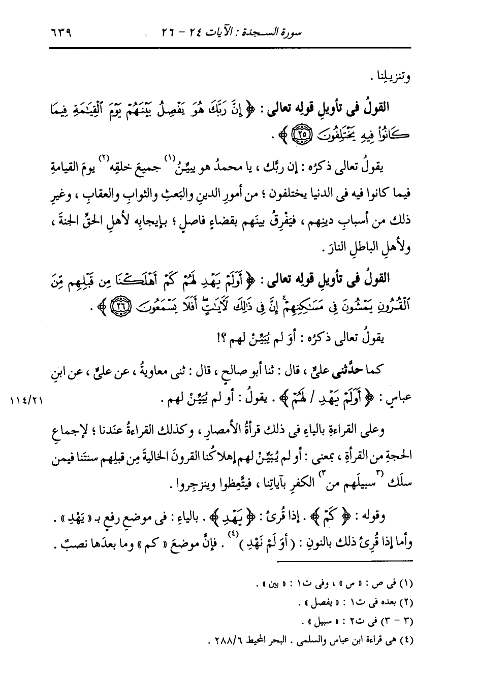 حَدَّثَنِي عَلِيٌّ، قَالَ: ثنا أَبُو صَالِحٍ، قَالَ: ثني مُعَاوِيَةُ، عَنْ عَلِيٍّ، عَنِ ابْنِ عَبَّاسٍ، " {§أَوَلَمْ يَهْدِ لَهُمْ} [السجدة: 26] يَقُولُ: أَوَ لَمْ يُبَيَّنْ لَهُمْ ". وَعَلَى الْقِرَاءَةِ بِالْيَاءِ فِي ذَلِكَ قُرَّاءُ الْأَمْصَارِ، وَكَذَلِكَ الْقِرَاءَةُ عِنْدَنَا لِإِجْمَاعِ الْحُجَّةِ مِنَ الْقُرَّاءِ، بِمَعْنَى: أَوَ لَمْ يُبَيِّنْ لَهُمْ إِهْلَاكَنَا الْقُرُونَ الْخَالِيَةَ مِنْ قَبْلِهِمْ، سُنَّتُنَا فِيمَنْ سَلَكَ سَبِيلَهُمْ مِنَ الْكُفْرِ بِآيَاتِنَا، فَيَتَّعِظُوا وَيَنْزَجِرُوا. وَقَوْلُهُ {كَمْ} [السجدة: 26] إِذَا قُرِئَ {يَهْدِ} [السجدة: 26] بِالْيَاءِ، فِي مَوْضِعِ رَفْعٍ بِـ {يَهْدِ} [السجدة: 26] . وَأَمَّا إِذَا قُرِئَ ذَلِكَ بِالنُّونِ «أَوَ لَمْ نَهْدِ» فَإِنَّ مَوْضِعَ {كَمْ} [السجدة: 26] وَمَا بَعْدَهَا نَصْبٌ. -[640]- وَقَوْلُهُ: {يَمْشُونَ فِي مَسَاكِنِهِمْ} [السجدة: 26] يَقُولُ تَعَالَى ذِكْرُهُ: أَوَ لَمْ يُبَيِّنْ لَهُمْ كَثْرَةَ إِهْلَاكِنَا الْقُرُونَ الْمَاضِيَةَ مِنْ قَبْلِهِمْ يَمْشُونَ فِي بِلَادِهِمْ وَأَرْضِهِمْ، كَعَادٍ وَثَمَودَ. كَمَا: