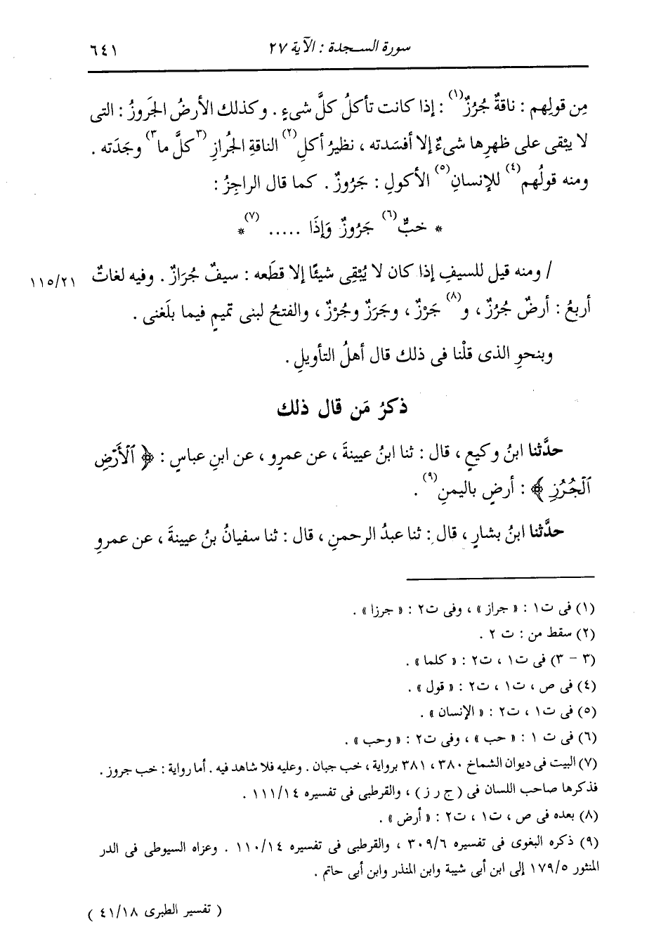 ذِكْرُ مَنْ قَالَ ذَلِكَ: حَدَّثَنَا ابْنُ وَكِيعٍ، قَالَ: ثنا ابْنُ عُيَيْنَةَ، عَنْ عَمْرٍو، عَنِ ابْنِ عَبَّاسٍ: «§الْأَرْضُ الْجُرُزُ، أَرْضٌ بِالْيَمَنِ» . حَدَّثَنَا ابْنُ بَشَّارٍ، قَالَ: ثنا عَبْدُ الرَّحْمَنِ، قَالَ: ثنا سُفْيَانُ بْنُ عُيَيْنَةَ، عَنْ عَمْرِو -[642]- بْنِ دِينَارٍ، عَنِ ابْنِ عَبَّاسٍ، قَالَ: أَرْضٌ بِالْيَمَنِ