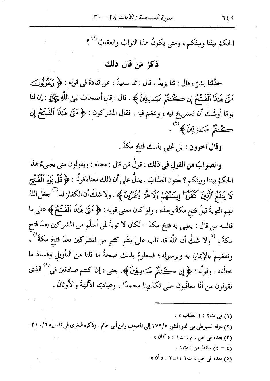ذِكْرُ مَنْ قَالَ ذَلِكَ: حَدَّثَنَا بِشْرٌ، قَالَ: ثنا يَزِيدُ، قَالَ: ثنا سَعِيدٌ، عَنْ قَتَادَةَ، فِي قَوْلِهِ " {§وَيَقُولُونَ مَتَى هَذَا الْفَتْحُ إِنْ كُنْتُمْ صَادِقِينَ} [السجدة: 28] قَالَ: قَالَ أَصْحَابُ نَبِيِّ اللَّهِ صَلَّى اللهُ عَلَيْهِ وَسَلَّمَ: إِنَّ لَنَا يَوْمًا أَوْشَكَ أَنْ نَسْتَرِيحَ فِيهِ وَنَنْعُمَ فِيهِ، فَقَالَ الْمُشْرِكُونَ {مَتَى هَذَا الْفَتْحُ إِنْ كُنْتُمْ صَادِقِينَ} [السجدة: 28] ". وَقَالَ آخَرُونَ: بَلْ عَنَى بِذَلِكَ: فَتْحُ مَكَّةَ. وَالصَّوَابُ مِنَ الْقَوْلِ فِي ذَلِكَ قَوْلُ مَنْ قَالَ: مَعْنَاهُ: وَيَقُولُونَ مَتَى يَجِيءُ هَذَا الْحُكْمُ بَيْنَنَا وَبَيْنَكُمْ، يَعْنُونَ الْعَذَابَ يَدُلُّ عَلَى أَنَّ ذَلِكَ مَعْنَاهُ قَوْلُهُ: {قُلْ يَوْمَ الْفَتْحِ لَا يَنْفَعُ الَّذِينَ كَفَرُوا إِيمَانُهُمْ وَلَا هُمْ يُنْظَرُونَ} [السجدة: 29] وَلَا شَكَّ أَنَّ الْكُفَّارَ قَدْ كَانَ جَعَلَ اللَّهُ لَهُمُ التَّوْبَةَ قَبْلَ فَتْحِ مَكَّةَ وَبَعْدَهُ، وَلَوْ كَانَ مَعْنَى قَوْلِهِ {مَتَى هَذَا الْفَتْحُ} [السجدة: 28] عَلَى مَا قَالَهُ مَنْ قَالَ: يَعْنِي بِهِ: فَتْحُ مَكَّةَ، لَكَانَ لَا تَوْبَةَ لِمَنْ أَسْلَمَ مِنَ الْمُشْرِكِينَ بَعْدَ فَتْحِ مَكَّةَ، وَلَا شَكَّ أَنَّ اللَّهَ قَدْ تَابَ عَلَى بَشَرً كَثِيرٍ مِنَ الْمُشْرِكِينَ بَعْدَ فَتْحِ مَكَّةَ وَنَفَعَهُمْ بِالْإِيمَانِ بِهِ وَبِرَسُولِهِ فَمَعْلُومٌ بِذَلِكَ صِحَّةُ مَا قُلْنَا مِنَ التَّأْوِيلَ، وَفَسَادُ مَا خَالَفَهُ. وَقَوْلُهُ: {إِنْ كُنْتُمْ صَادِقِينَ} [البقرة: 23] يَعْنِي: إِنْ كُنْتُمْ صَادِقِينَ فِي الَّذِي تَقُولُونَ مِنْ أَنَّا مُعَاقَبُونَ عَلَى تَكْذِيبِنَا مُحَمَّدًا صَلَّى اللهُ عَلَيْهِ وَسَلَّمَ، وَعِبَادَتِنَا الْآلِهَةَ وَالْأَوْثَانَ.