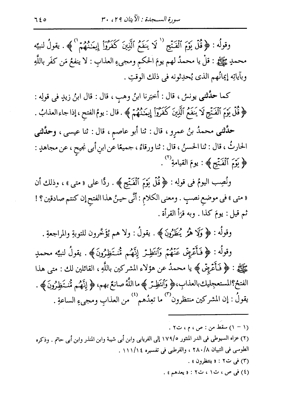حَدَّثَنِي مُحَمَّدُ بْنُ عَمْرٍو، قَالَ: ثنا أَبُو عَاصِمٍ، قَالَ: ثنا عِيسَى، وَحَدَّثَنِي الْحَارِثُ، قَالَ: ثنا الْحَسَنُ، قَالَ: ثنا وَرْقَاءُ، جَمِيعًا عَنِ ابْنِ أَبِي نَجِيحٍ، عَنْ مُجَاهِدٍ، " {§يَوْمَ الْفَتْحِ} [السجدة: 29] يَوْمَ الْقِيَامَةِ ". وَنَصُّ الْيَوْمَ فِي قَوْلِهِ {قُلْ يَوْمَ الْفَتْحِ} [السجدة: 29] رَدًّا عَلَى مَتَى وَذَلِكَ أَنَّ مَتَى فِي مَوْضِعِ نَصْبٍ. وَمَعْنَى الْكَلَامِ: أَنِّي حِينَ هَذَا الْفَتْحِ إِنْ كُنْتُمْ صَادِقِينَ، ثُمَّ قِيلَ يَوْمَ كَذَا، وَبِهِ قَرَأَ الْقُرَّاءُ