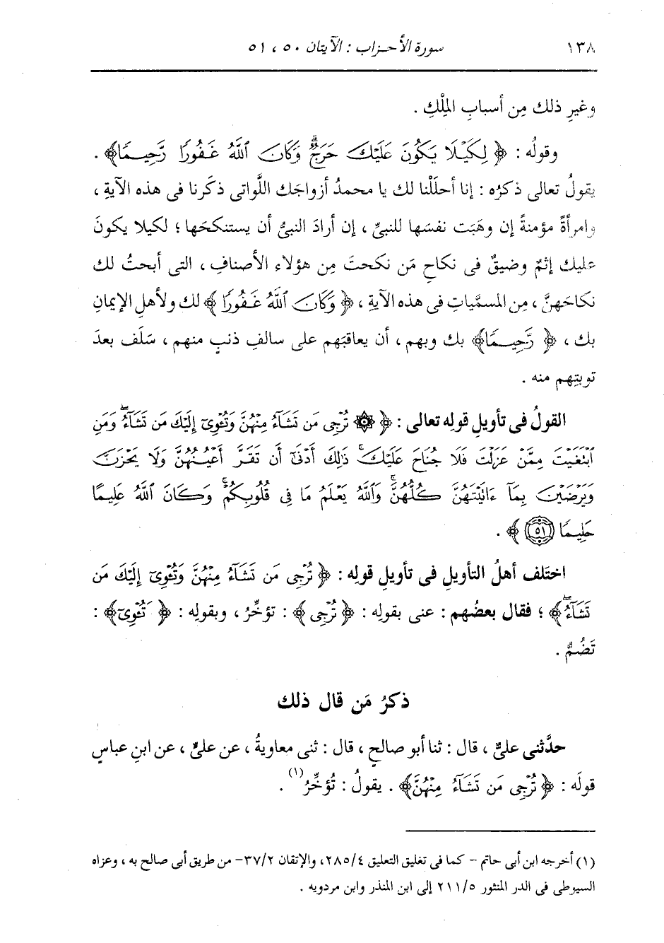 ذِكْرُ مَنْ قَالَ ذَلِكَ: حَدَّثَنِي عَلِيٌّ، قَالَ: ثنا أَبُو صَالِحٍ، قَالَ: ثني مُعَاوِيَةُ، عَنْ عَلِيٍّ، عَنِ ابْنِ عَبَّاسٍ، قَوْلُهُ: {§تُرْجِي مَنْ تَشَاءُ مِنْهُنَّ} [الأحزاب: 51] يَقُولُ: «تُؤَخِّرُ»