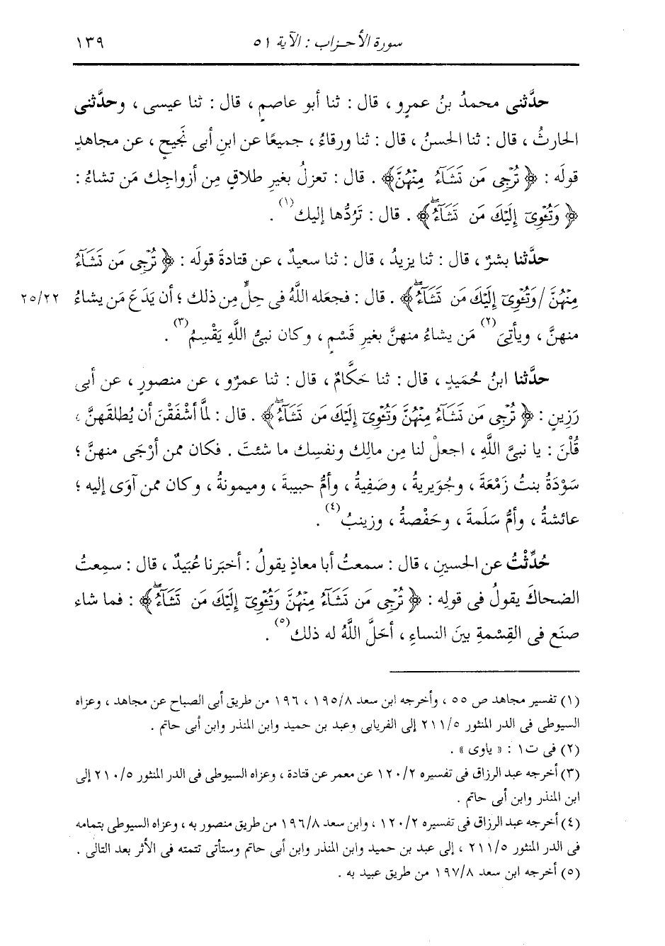 حَدَّثَنِي مُحَمَّدُ بْنُ عَمْرٍو، قَالَ: ثنا أَبُو عَاصِمٍ، قَالَ: ثنا عِيسَى، وَحَدَّثَنِي الْحَارِثُ، قَالَ: ثنا الْحَسَنُ، قَالَ: ثنا وَرْقَاءُ، جَمِيعًا عَنِ ابْنِ أَبِي نَجِيحٍ، عَنْ مُجَاهِدٍ، قَوْلُهُ: {§تُرْجِي مَنْ تَشَاءُ مِنْهُنَّ} [الأحزاب: 51] قَالَ: «تَعْزِلُ بِغَيْرِ طَلَاقٍ مِنْ أَزْوَاجِكَ مَنْ تَشَاءُ» {وَتُؤْوِي إِلَيْكَ مَنْ تَشَاءُ} [الأحزاب: 51] قَالَ: «تَرُدُّهَا إِلَيْكَ»