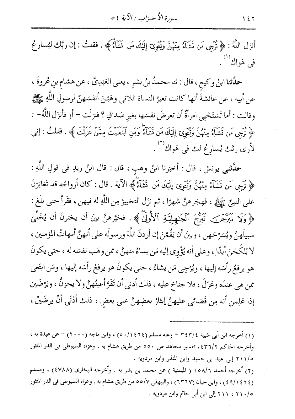 حَدَّثَنِي يُونُسُ، قَالَ: أَخْبَرَنَا ابْنُ وَهْبٍ، قَالَ: قَالَ ابْنُ زَيْدٍ، فِي قَوْلِ اللَّهِ: {§تُرْجِي مَنْ تَشَاءُ مِنْهُنَّ وَتُؤْوِي إِلَيْكَ مَنْ تَشَاءُ} [الأحزاب: 51] الْآيَةُ قَالَ: " كَانَ أَزْوَاجُهُ قَدْ تَغَايَرْنَ عَلَى النَّبِيِّ صَلَّى اللهُ عَلَيْهِ وَسَلَّمَ، فَهَجَرَهُنَّ شَهْرًا، ثُمَّ نَزَلَ التَّخْيِيرُ مِنَ اللَّهِ لَهُ فِيهِنَّ، فَقَرَأَ حَتَّى بَلَغَ: {وَلَا تَبَرَّجْنَ تَبَرُّجَ الْجَاهِلِيَّةِ الْأُولَى} [الأحزاب: 33] فَخَيَّرْهُنَّ بَيْنَ أَنْ يَخْتَرْنَ أَنْ يُخْلِيَ سَبِيلَهُنَّ وَيُسَرِّحْهُنَّ وَبَيْنَ أَنْ يُقِمْنَ إِنْ أَرَدْنَ اللَّهَ وَرَسُولَهُ عَلَى أَنَّهُنَّ أُمَّهَاتُ الْمُؤْمِنِينَ، لَا يَنْكِحْنَ أَبَدًا، وَعَلَى أَنَّهُ يُؤْوِي إِلَيْهِ مَنْ يَشَاءُ مِنْهُنَّ مِمَّنْ وَهَبَتْ نَفْسَهَا لَهُ حَتَّى يَكُونَ هُوَ يَرْفَعُ رَأْسَهُ إِلَيْهَا، وَيُرْجِي مَنْ يَشَاءُ، حَتَّى يَكُونَ هُوَ يَرْفَعُ رَأْسَهُ إِلَيْهَا، وَمَنِ ابْتَغَى مِمَّنْ هِيَ عِنْدَهُ وَعَزَلَ فَلَا جُنَاحَ عَلَيْهِ، ذَلِكَ أَدْنَى أَنْ تَقَرَّ أَعْيُنُهُنَّ وَلَا يَحْزَنَّ، وَيَرْضَيْنَ إِذَا عَلِمْنَ أَنَّهُ مِنْ قَضَائِي عَلَيْهِنَّ إِيثَارُ بَعْضِهِنَّ عَلَى بَعْضٍ {ذَلِكَ أَدْنَى أَنْ} [المائدة: 108] يَرْضَيْنَ، -[143]- قَالَ: {وَمَنِ ابْتَغَيْتَ} [الأحزاب: 51] مِمَّنْ عَزَلْتَ: مِنَ ابْتَغَى أَصَابَهُ، وَمَنْ عَزَلَ لَمْ يُصِبْهُ، فَخَيَّرَهُنَّ بَيْنَ أَنْ يَرْضَيْنَ بِهَذَا، أَوْ يُفَارِقَهُنَّ، فَاخْتَرْنَ اللَّهَ وَرَسُولَهُ، إِلَّا امْرَأَةً وَاحِدَةً بَدَوِيَّةً ذَهَبَتْ وَكَانَ عَلَى ذَلِكَ صَلَوَاتُ اللَّهِ عَلَيْهِ، وَقَدْ شَرَطَ اللَّهُ لَهُ هَذَا الشَّرْطَ، مَا زَالَ يَعْدِلُ بَيْنَهُنَّ حَتَّى لَقِيَ اللَّهَ " وَأَوْلَى الْأَقْوَالِ فِي ذَلِكَ عِنْدِي بِالصَّوَابِ أَنْ يُقَالَ: إِنَّ اللَّهَ تَعَالَى ذِكْرُهُ جَعَلَ لِنَبِيِّهِ أَنْ يُرْجِي مِنَ النِّسَاءِ اللَّوَاتِي أَحَلَّهُنَّ لَهُ مَنْ يَشَاءُ، وَيُؤْوِي إِلَيْهِ مِنْهُنَّ مَنْ يَشَاءُ، وَذَلِكَ أَنَّهُ لَمْ يَحْصُرْ مَعْنَى الْإِرْجَاءِ وَالْإِيوَاءِ عَلَى الْمَنْكُوحَاتِ اللَّوَاتِي كُنَّ فِي حِبَالِهِ، عِنْدَمَا نَزَلَتْ هَذِهِ الْآيَةُ دُونَ غَيْرِهِنَّ مِمَّنْ يَسْتَحْدِثُ إِيوَاؤُهَا أَوْ إِرْجَاؤُهَا مِنْهُنَّ إِذَا كَانَ ذَلِكَ كَذَلِكَ، فَمَعْنَى الْكَلَامِ: تُؤَخِّرُ مَنْ تَشَاءُ مِمَّنْ وَهَبَتْ نَفْسَهَا لَكَ، وَأَحْلَلْتُ لَكَ نِكَاحَهَا، فَلَا تَقْبَلْهَا وَلَا تَنْكِحْهَا، أَوْ مِمَّنْ هُنَّ فِي حِبَالِكَ، فَلَا تَقْرَبْهَا، وَتَضُمُ إِلَيْكَ مَنْ تَشَاءُ مِمَّنْ وَهَبَتْ نَفْسَهَا لَكَ، أَوْ أَرَدْتَ مِنَ النِّسَاءِ الَّتِي أَحْلَلْتُ لَكَ نِكَاحَهُنَّ، فَتَقْبَلُهَا أَوْ تَنْكِحُهَا، وَمِمَّنْ هِيَ فِي حِبَالِكَ فَتُجَامِعْهَا إِذَا شِئْتَ، وَتَتْرُكَهَا إِذَا شِئْتَ بِغَيْرِ قَسْمٍ