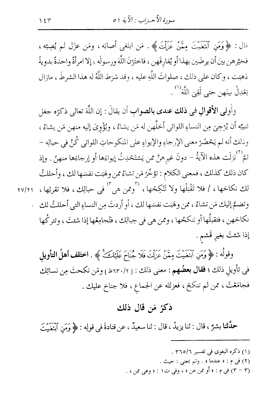 ذِكْرُ مَنْ قَالَ ذَلِكَ: حَدَّثَنَا بِشْرٌ، قَالَ: ثنا يَزِيدُ، قَالَ: ثنا سَعِيدٌ، عَنْ قَتَادَةَ، فِي قَوْلِهِ: {§وَمَنِ ابْتَغَيْتَ -[144]- مِمَّنْ عَزَلْتَ فَلَا جُنَاحَ عَلَيْكَ} [الأحزاب: 51] قَالَ: «جَمِيعًا هَذِهِ فِي نِسَائِهِ، إِنَّ شَاءَ أَتَى مَنْ شَاءَ مِنْهُنَّ، وَلَا جُنَاحَ عَلَيْهِ»