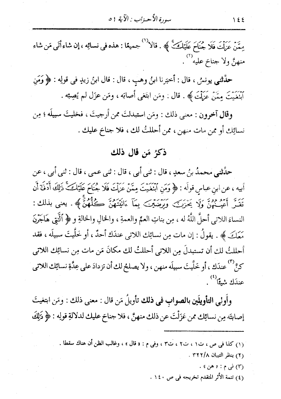 حَدَّثَنِي يُونُسُ، قَالَ: أَخْبَرَنَا ابْنُ وَهْبٍ، قَالَ: قَالَ ابْنُ زَيْدٍ، فِي قَوْلِهِ: {§وَمَنِ ابْتَغَيْتَ مِمَّنْ عَزَلْتَ} [الأحزاب: 51] قَالَ: «وَمَنِ ابْتَغَى أَصَابَهُ، وَمَنْ عَزَلَ لَمْ يُصِبْهُ» وَقَالَ آخَرُونَ: مَعْنَى ذَلِكَ: وَمَنِ اسْتَبْدَلْتَ مِمَّنْ أَرْجَيْتَ، فَخَلَّيْتَ سَبِيلَهُ مِنْ نِسَائِكَ، أَوْ مِمَّنْ مَاتَ مِنْهُنَّ مِمَّنْ أُحْلِلَتْ لَكَ فَلَا جُنَاحَ عَلَيْكَ