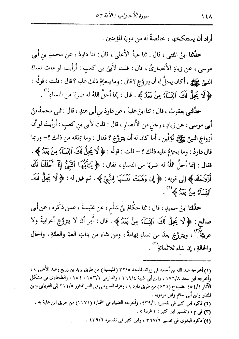 حَدَّثَنِي يَعْقُوبُ، قَالَ: ثنا ابْنُ عُلَيَّةَ، عَنْ دَاوُدَ بْنِ أَبِي هِنْدَ، قَالَ: ثني مُحَمَّدُ بْنُ أَبِي مُوسَى، عَنْ زِيَادٍ، رَجُلٍ مِنَ الْأَنْصَارِ، قَالَ: قُلْتُ لِأُبَيِّ بْنِ كَعْبٍ: أَرَأَيْتَ لَوْ أَنَّ أَزْوَاجَ النَّبِيِّ صَلَّى اللهُ عَلَيْهِ وَسَلَّمَ تُوِفِّينَ، أَمَا كَانَ لَهُ أَنْ يَتَزَوَّجَ؟ فَقَالَ: وَمَا يَمْنَعُهُ مِنْ ذَلِكَ؟ وَرُبَّمَا قَالَ دَاوُدُ: وَمَا يُحَرِّمُ عَلَيْهِ ذَلِكَ؟ قُلْتُ: قَوْلُهُ: {§لَا يَحِلُّ لَكَ النِّسَاءُ مِنْ بَعْدُ} [الأحزاب: 52] فَقَالَ: " إِنَّمَا أَحَلَّ اللَّهُ لَهُ ضَرْبًا مِنَ النِّسَاءِ، فَقَالَ: {يَا أَيُّهَا النَّبِيُّ إِنَّا أَحْلَلْنَا لَكَ أَزْوَاجَكَ} [الأحزاب: 50] . . إِلَى قَوْلِهِ: {إِنْ وَهَبَتْ} [الأحزاب: 50] نَفْسَهَا لِلنَّبِيِّ ثُمَّ قِيلَ لَهُ: {لَا يَحِلُّ لَكَ النِّسَاءُ مِنْ بَعْدُ} [الأحزاب: 52]