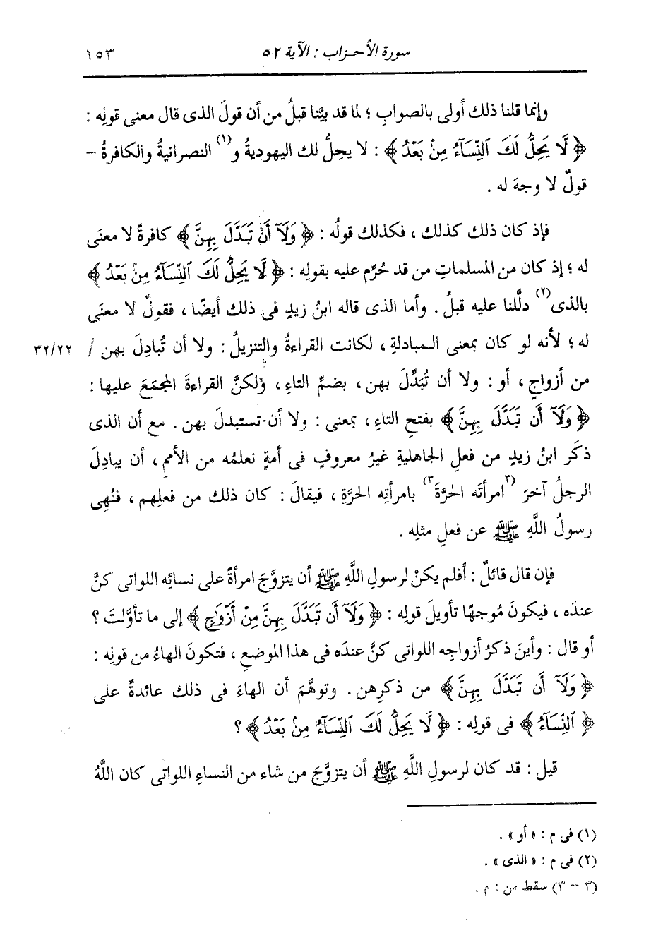 وَأَنَّمَا قُلْنَا ذَلِكَ أَوْلَى بِالصَّوَابِ، لِمَا قَدْ بَيْنَنَا قَبْلُ مِنْ أَنَّ قَوْلَ الَّذِي قَالَ مَعْنَى قَوْلِهِ: {لَا يَحِلُّ لَكَ النِّسَاءُ مِنْ بَعْدُ} [الأحزاب: 52] لَا يَحِلُّ لَكَ الْيَهُودِيَّةُ أَوِ النَّصْرَانِيَّةُ وَالْكَافِرَةُ، قَوْلٌ لَا وَجْهَ لَهُ فَإِذْا كَانَ ذَلِكَ كَذَلِكَ فَكَذَلِكَ قَوْلُهُ: {وَلَا أَنْ تَبَدَّلَ بِهِنَّ} [الأحزاب: 52] كَافِرَةً لَا مَعْنَى لَهُ، إِذْ كَانَ مِنَ الْمُسْلِمَاتِ مَنْ قَدْ حُرِّمَ عَلَيْهِ بِقَوْلِهِ {لَا يَحِلُّ لَكَ النِّسَاءُ مِنْ بَعْدُ} [الأحزاب: 52] الَّذِي دَلَّلْنَا عَلَيْهِ قَبْلُ وَأَمَّا الَّذِي قَالَهُ ابْنُ زَيْدٍ فِي ذَلِكَ أَيْضًا، فَقَوْلٌ لَا مَعْنَى لَهُ، لِأَنَّهُ لَوْ كَانَ بِمَعْنَى الْمُبَادَلَةِ، لَكَانَتِ الْقِرَاءَةُ وَالتَّنْزِيلُ: وَلَا أَنْ تُبَادِلَ بِهِنَّ مِنْ أَزْوَاجٍ، أَوْ: وَلَا أَنْ تُبَدِّلَ بِهِنَّ بِضَمِّ التَّاءِ؛ وَلَكِنَّ الْقِرَاءَةَ الْمُجْمَعَ عَلَيْهَا {وَلَا أَنْ تَبَدَّلَ بِهِنَّ} [الأحزاب: 52] بِفَتْحِ التَّاءِ، بِمَعْنَى: وَلَا أَنْ تَسْتَبْدِلَ بِهِنَّ، مَعَ أَنَّ الَّذِيَ ذَكَرَ ابْنُ زَيْدٍ مِنْ فِعْلِ الْجَاهِلِيَّةِ غَيْرُ مَعْرُوفٍ فِي أُمَّةٍ نَعْلَمُهُ مِنَ الْأُمَمِ: أَنْ يُبَادِلَ الرَّجُلُ آخَرَ بِامْرَأَتِهِ الْحُرَّةِ، فَيُقَالُ: كَانَ ذَلِكَ مِنْ فِعْلِهِمْ، فَنَهَى رَسُولُ اللَّهِ صَلَّى اللهُ عَلَيْهِ وَسَلَّمَ عَنْ فِعْلٍ مِثْلِهِ فَإِنْ قَالَ قَائِلٌ: أَفَلَمْ يَكُنْ لِرَسُولِ اللَّهِ صَلَّى اللهُ عَلَيْهِ وَسَلَّمَ أَنْ يَتَزَوَّجَ امْرَأَةً عَلَى نِسَائِهِ اللَّوَاتِي كُنَّ عِنْدَهُ، فَيَكُونُ مُوَجِّهًا تَأْوِيلَ قَوْلِهِ: {وَلَا أَنْ تَبَدَّلَ بِهِنَّ مِنْ أَزْوَاجٍ} [الأحزاب: 52] إِلَى مَا تَأَوَّلَتْ، أَوْ قَالَ: وَأَيْنَ ذَكَرَ أَزْوَاجَهُ اللَّوَاتِي كُنَّ عِنْدَهُ فِي هَذَا الْمَوْضِعِ، فَتَكُونُ الْهَاءُ مِنْ قَوْلِهِ: {وَلَا أَنْ تَبَدَّلَ بِهِنَّ} [الأحزاب: 52] مِنْ ذِكْرِهِنَّ وَتَوَهَّمَ أَنَّ الْهَاءَ فِي ذَلِكَ عَائِدَةٌ عَلَى النِّسَاءِ، فِي قَوْلِهِ: {لَا يَحِلُّ لَكَ النِّسَاءُ مِنْ بَعْدُ} [الأحزاب: 52] قِيلَ: قَدْ كَانَ لِرَسُولِ اللَّهِ صَلَّى اللهُ عَلَيْهِ وَسَلَّمَ أَنْ يَتَزَوَّجَ مَنْ شَاءَ مِنَ النِّسَاءِ اللَّوَاتِي كَانَ اللَّهُ