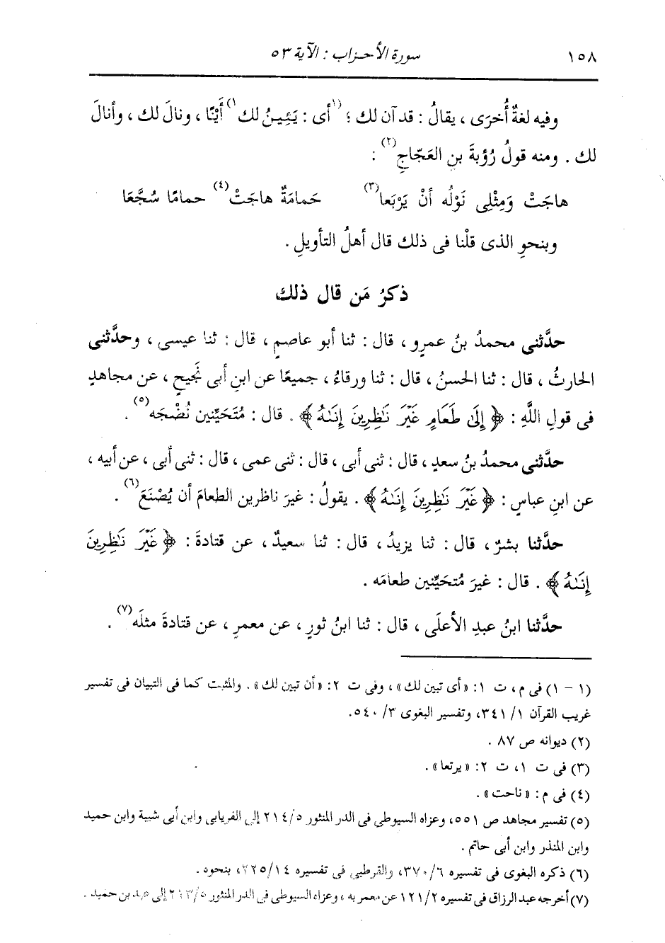 حَدَّثَنَا بِشْرٌ، قَالَ: ثنا يَزِيدُ، قَالَ: ثنا سَعِيدٌ، عَنْ قَتَادَةَ {§غَيْرَ نَاظِرِينَ إِنَاهُ} [الأحزاب: 53] قَالَ: «غَيْرَ مُتَحَيِّنِينَ طَعَامَهُ» حَدَّثَنَا ابْنُ عَبْدِ الْأَعْلَى، قَالَ: ثنا ابْنُ ثَوْرٍ، عَنْ مَعْمَرٍ، عَنْ قَتَادَةَ، مِثْلَهُ -[159]- وَنَصَبَ {غَيْرَ} [الأحزاب: 53] فِي قَوْلِهِ: {غَيْرَ نَاظِرِينَ إِنَاهُ} [الأحزاب: 53] عَلَى الْحَالِ مِنَ الْكَافِ وَالْمِيمِ فِي قَوْلِهِ: {إِلَّا أَنْ يُؤَذَنَ لَكُمْ} [الأحزاب: 53] لِأَنَّ الْكَافَ وَالْمِيمَ مَعْرِفَةٌ وَغَيْرُ نَكِرَةٍ، وَهِيَ مِنْ صِفَةِ الْكَافِ وَالْمِيمِ وَكَانَ بَعْضُ نَحْوِيِّي الْبَصْرَةِ يَقُولُ: لَا يَجُوزُ فِي «غَيْرَ» الْجَرُّ عَلَى الطَّعَامِ، إِلَّا أَنْ تَقُولَ: أَنْتُمْ، وَيَقُولُ: أَلَا تَرَى أَنَّكَ لَوْ قُلْتُ: أَبْدَى لِعَبْدِ اللَّهِ عَلِيٌّ امْرَأَةً مُبْغِضًا لَهَا، لَمْ يَكُنْ فِيهِ إِلَّا النَّصْبَ، إِلَّا أَنْ تَقُولَ: مُبْغِضٌ لَهَا هُوَ، لِأَنَّكَ إِذَا أَجْرَيْتَ صِفَتَهُ عَلَيْهَا، وَلَمْ تُظْهِرِ الضَّمِيرَ الَّذِي يَدُلُّ عَلَى أَنَّ الصِّفَةَ لَهُ لَمْ يَكُنْ كَلَامًا، لَوْ قُلْتَ: هَذَا رَجُلٌ مَعَ امْرَأَةٍ مُلَازِمَهَا، كَانَ لَحْنًا، حَتَّى تَرْفَعَ، فَتَقُولُ مُلَازِمُهَا، أَوْ تَقُولُ مُلَازِمِهَا هُوَ، فَتُجَرُّ وَكَانَ بَعْضُ نَحْوِيِّي الْكُوفَةِ يَقُولُ: لَوْ جَعَلْتَ «غَيْرَ» فِي قَوْلِهِ: {غَيْرَ نَاظِرِينَ إِنَاهُ} [الأحزاب: 53] خَفْضًا كَانَ صَوَابًا، لِأَنَّ قَبْلَهَا الطَّعَامَ وَهُوَ نَكِرَةٌ، فَيُجْعَلُ فِعْلَهُمْ تَابِعًا لِلطَّعَامِ، لِرُجُوعِ ذِكْرِ الطَّعَامِ فِي إِنَاهُ، كَمَا تَقُولُ الْعَرَبُ: رَأَيْتُ زَيْدًا مَعَ امْرَأَةٍ مُحْسِنًا إِلَيْهَا وَمُحْسِنٌ إِلَيْهَا، فَمَنْ قَالَ مُحْسِنًا جَعَلَهُ مِنْ صِفَةِ زَيْدٍ، وَمَنْ خَفَضَهُ فَكَأَنَّهُ قَالَ: رَأَيْتُهُ مَعَ الَّتِي يُحْسِنُ إِلَيْهَا؛ فَإِذَا صَارَتِ الصِّلَةُ لِلْنَكِرَةِ أَتْبَعْتَهَا وَإِنْ كَانَتْ فِعْلًا لِغَيْرِ النَّكِرَةِ، كَمَا قَالَ الْأَعْشَى: