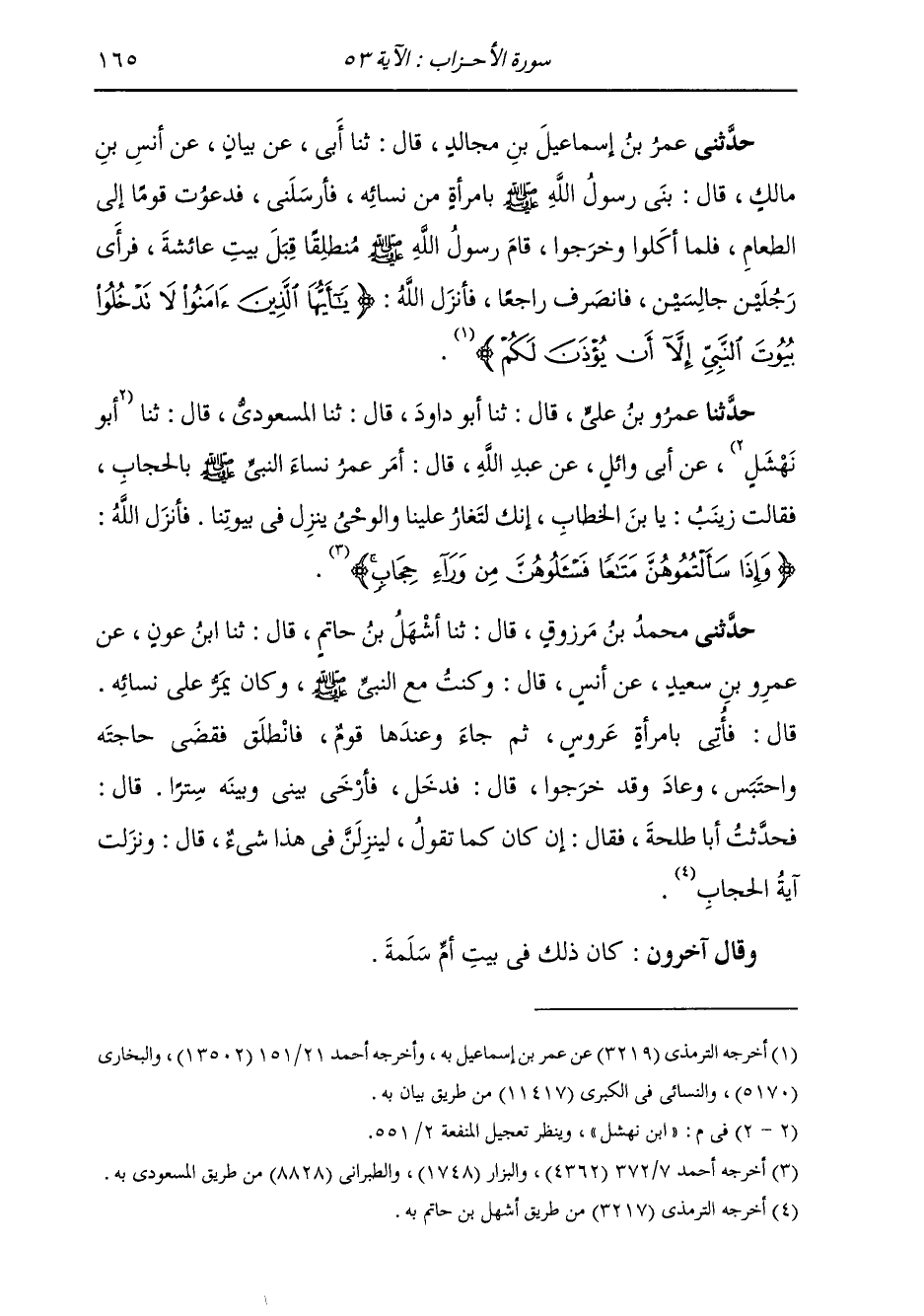 حَدَّثَنِي مُحَمَّدُ بْنُ مَرْزُوقٍ، قَالَ: ثنا أَشْهَلُ بْنُ حَاتِمٍ، قَالَ: ثنا ابْنُ عَوْنٍ، عَنْ عَمْرِو بْنِ سَعْدٍ، عَنْ أَنَسٍ قَالَ: " §وَكُنْتُ مَعَ النَّبِيِّ صَلَّى اللهُ عَلَيْهِ وَسَلَّمَ، وَكَانَ يَمُرُّ عَلَى نِسَائِهِ، قَالَ: فَأَتَى بِامْرَأَةٍ عَرُوسٍ، ثُمَّ جَاءَ وَعِنْدَهَا قَوْمٌ، فَانْطَلَقَ فَقَضَى حَاجَتَهُ، وَاحْتَبَسَ وَعَادَ وَقَدْ خَرَجُوا؛ قَالَ: فَدَخَلَ فَأَرْخَى بَيْنِي وَبَيْنَهُ سِتْرًا " قَالَ: فَحَدَّثْتُ أَبَا طَلْحَةَ، فَقَالَ: إِنْ كَانَ كَمَا تَقُولُ: لَيَنْزِلَنَّ فِي هَذَا شَيْءٌ، قَالَ: وَنَزَلَتْ آيَةُ الْحِجَابِ " وَقَالَ آخَرُونَ: كَانَ ذَلِكَ فِي بَيْتِ أُمِّ سَلَمَةَ