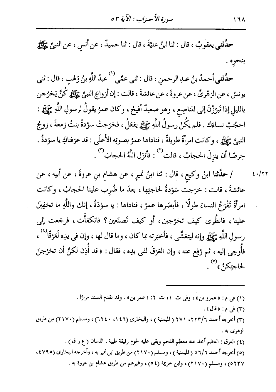 حَدَّثَنَا ابْنُ وَكِيعٍ، قَالَ: ثنا ابْنُ نُمَيْرٍ، عَنْ هِشَامِ بْنِ عُرْوَةَ، عَنْ أَبِيهِ، عَنْ عَائِشَةَ، قَالَتْ: خَرَجَتْ سَوْدَةُ لِحَاجَتِهَا بَعْدَمَا ضُرِبَ عَلَيْنَا الْحِجَابُ، وَكَانَتِ امْرَأَةً تَفْرَعُ النِّسَاءَ طَوْلًا، فَأَبْصَرَهَا عُمَرُ، فَنَادَاهَا: يَا سَوْدَةَ، إِنَّكِ وَاللَّهِ مَا تَخْفَيْنَ عَلَيْنَا، فَانْظُرِي كَيْفَ تَخْرُجِينَ، أَوْ كَيْفَ تَصْنَعِينَ؟ فَانْكَفَأَتْ فَرَجَعَتْ إِلَى رَسُولِ اللَّهِ صَلَّى اللهُ عَلَيْهِ وَسَلَّمَ وَإِنَّهُ لَيَتَعَشَّى، فَأَخْبَرَتْهُ بِمَا كَانَ، وَمَا قَالَ لَهَا، وَإِنَّ فِي يَدِهِ لَعَرْقًا، فَأُوحِيَ إِلَيْهِ، ثُمَّ رَفَعَ عَنْهُ، وَإِنَّ الْعَرْقَ لَفِي يَدِهِ، فَقَالَ: «§لَقَدْ أُذِنَ لَكُنَّ أَنْ تَخْرُجْنَ لِحَاجَتِكُنَّ»