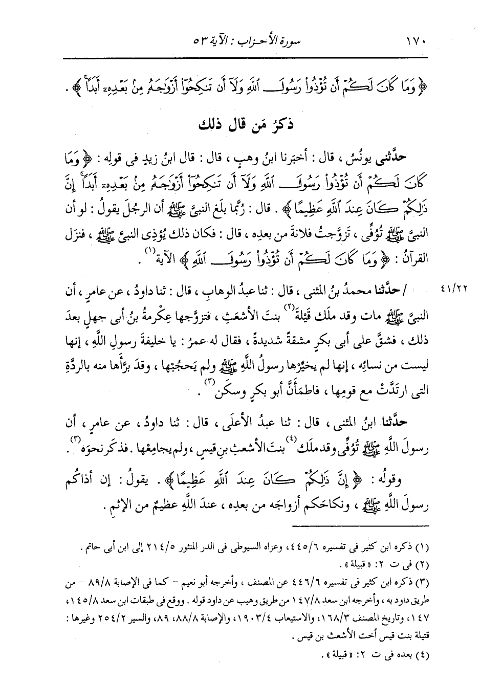 ذِكْرُ مَنْ قَالَ ذَلِكَ: حَدَّثَنِي يُونُسُ، قَالَ: أَخْبَرَنَا ابْنُ وَهْبٍ، قَالَ: قَالَ ابْنُ زَيْدٍ فِي قَوْلِهِ: {§وَمَا كَانَ لَكُمْ أَنْ تُؤْذُوا رَسُولَ اللَّهِ وَلَا أَنْ تَنْكِحُوا أَزْوَاجَهُ مِنْ بَعْدِهِ أَبَدًا إِنَّ ذَلِكُمْ كَانَ عِنْدَ اللَّهِ عَظِيمًا} [الأحزاب: 53] قَالَ: " رُبَّمَا بَلَغَ النَّبِيَّ صَلَّى اللهُ عَلَيْهِ وَسَلَّمَ أَنَّ الرَّجُلَ يَقُولُ: لَوْ أَنَّ النَّبِيَّ صَلَّى اللهُ عَلَيْهِ وَسَلَّمَ تُوِفِّيَ تَزَوَّجْتُ فُلَانَةَ مِنْ بَعْدِهِ، قَالَ: فَكَانَ ذَلِكَ يُؤْذِي النَّبِيَّ صَلَّى اللهُ عَلَيْهِ وَسَلَّمَ، فَنَزَلَ الْقُرْآنُ: {وَمَا كَانَ لَكُمْ أَنْ تُؤْذُوا رَسُولَ اللَّهِ} [الأحزاب: 53] . . الْآيَةُ "