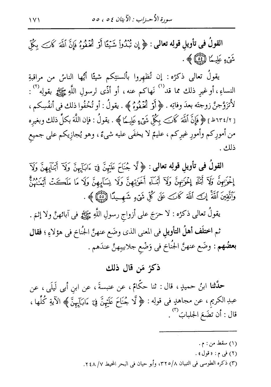 §الْقَوْلُ فِي تَأْوِيلِ قَوْلِهِ تَعَالَى: {لَّا جُنَاحَ عَلَيْهِنَّ فِي آبَائِهِنَّ وَلَا أَبْنَائِهِنَّ وَلَا إِخْوَانِهِنَّ وَلَا أَبْنَاءِ إِخْوَانِهِنَّ وَلَا أَبْنَاءِ أَخَوَاتِهِنَّ وَلَا نِسَائِهِنَّ وَلَا مَا مَلَكَتْ أَيْمَانُهُنَّ وَاتَّقِينَ اللَّهَ إِنَّ اللَّهَ كَانَ عَلَى كُلِّ شَيْءٍ شَهِيدًا} [الأحزاب: 55] يَقُولُ تَعَالَى ذِكْرُهُ: لَا حَرَجَ عَلَى أَزْوَاجِ رَسُولِ اللَّهِ صَلَّى اللهُ عَلَيْهِ وَسَلَّمَ فِي آبَائِهِنَّ وَلَا إِثْمَ ثُمَّ اخْتَلَفَ أَهْلُ التَّأْوِيلَ فِي الْمَعْنَى الَّذِي وَضَعَ عَنْهُنَّ الْجُنَاحَ فِي هَؤُلَاءِ، فَقَالَ بَعْضُهُمْ: وَضَعَ عَنْهُنَّ الْجُنَاحَ فِي وَضْعِ جَلَابِيبِهِنَّ عِنْدَهُمْ