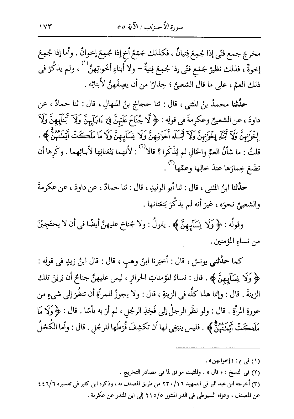 حَدَّثَنَا مُحَمَّدُ بْنُ الْمُثَنَّى، قَالَ: ثنا حَجَّاجُ بْنُ الْمِنْهَالِ، قَالَ: ثنا حَمَّادٌ، عَنْ دَاوُدَ، عَنِ الشَّعْبِيِّ، وَعِكْرِمَةَ، فِي قَوْلِهِ: {§لَّا جُنَاحَ عَلَيْهِنَّ فِي آبَائِهِنَّ وَلَا أَبْنَائِهِنَّ وَلَا إِخْوَانِهِنَّ وَلَا أَبْنَاءِ إِخْوَانِهِنَّ وَلَا أَبْنَاءِ أَخَوَاتِهِنَّ وَلَا نِسَائِهِنَّ وَلَا مَا مَلَكَتْ أَيْمَانُهُنَّ} [الأحزاب: 55] قُلْتُ: مَا شَأْنُ الْعَمِّ وَالْخَالِ لَمْ يَذْكُرَا؟ قَالَ: «لِأَنَّهُمَا يَنْعِتَانِهَا لِأَبْنَائِهِمَا، وَكَرِهَا أَنْ تَضَعَ خِمَارَهَا عِنْدَ خَالِهَا وَعَمِّهَا» حَدَّثَنَا ابْنُ الْمُثَنَّى، قَالَ: ثنا أَبُو الْوَلِيدِ، قَالَ: ثنا حَمَّادٌ، عَنْ دَاوُدَ، عَنْ عِكْرِمَةَ وَالشَّعْبِيِّ نَحْوَهُ، غَيْرُ أَنَّهُ لَمْ يَذْكُرْ يَنْعَتَانِهَا