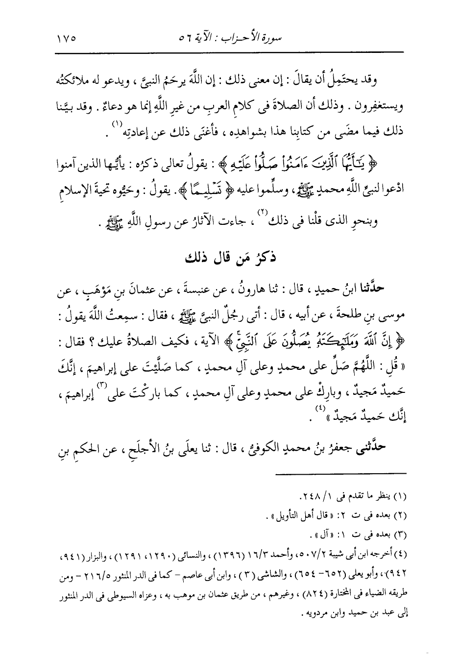 ذِكْرُ مَنْ قَالَ ذَلِكَ: حَدَّثَنَا ابْنُ حُمَيْدٍ، قَالَ: ثنا هَارُونُ، عَنْ عَنْبَسَةَ، عَنْ عُثْمَانَ بْنِ مَوْهَبٍ، عَنْ مُوسَى بْنِ طَلْحَةَ، عَنْ أَبِيهِ، قَالَ: أَتَى رَجُلٌ النَّبِيَّ صَلَّى اللهُ عَلَيْهِ وَسَلَّمَ، فَقَالَ: سَمِعْتُ اللَّهَ يَقُولُ: {إِنَّ اللَّهَ وَمَلَائِكَتَهُ يُصَلُّونَ عَلَى النَّبِيِّ} [الأحزاب: 56] . . الْآيَةُ، فَكَيْفَ الصَّلَاةُ عَلَيْكَ؟ فَقَالَ: " §قُلِ: اللَّهُمَّ صَلِّ عَلَى مُحَمَّدٍ وَعَلَى آلِ مُحَمَّدٍ، كَمَا صَلَّيْتَ عَلَى إِبْرَاهِيمَ إِنَّكَ حُمَيْدٌ مَجِيدٌ، وَبَارِكْ عَلَى مُحَمَّدٍ وَعَلَى آلِ مُحَمَّدٍ، كَمَا بَارَكْتَ عَلَى إِبْرَاهِيمَ إِنَّكَ حُمَيْدٌ مَجِيدٌ "