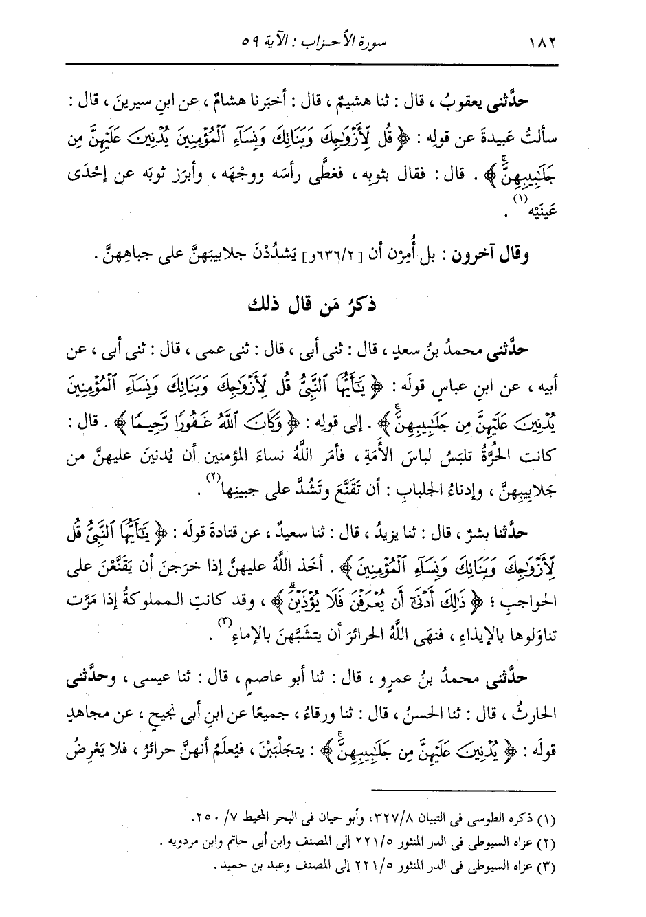 ذِكْرُ مَنْ قَالَ ذَلِكَ: حَدَّثَنِي مُحَمَّدُ بْنُ سَعْدٍ، قَالَ: ثني أَبِي، قَالَ: ثني عَمِّي، قَالَ: ثني أَبِي، عَنْ أَبِيهِ، عَنِ ابْنِ عَبَّاسٍ، قَوْلُهُ: {§يَا أَيُّهَا النَّبِيُّ قُلْ لِأَزْوَاجِكَ وَبَنَاتِكَ وَنِسَاءِ الْمُؤْمِنِينَ يُدْنِينَ عَلَيْهِنَّ مِنْ جَلَابِيبِهِنَّ} [الأحزاب: 59] . . . . إِلَى قَوْلِهِ: {وَكَانَ اللَّهُ غَفُورًا رَحِيمًا} [النساء: 96] قَالَ: " كَانَتِ الْحَرَّةُ تَلْبَسُ لِبَاسَ الْأَمَةِ، فَأَمَرَ اللَّهُ نِسَاءَ الْمُؤْمِنِينَ أَنْ يُدْنِينَ عَلَيْهِنَّ مِنْ جَلَابِيبِهِنَّ؛ وَإِدْنَاءُ الْجِلْبَابِ: أَنْ تَقَنَّعَ وَتَشُدَّ عَلَى جَبِينِهَا "