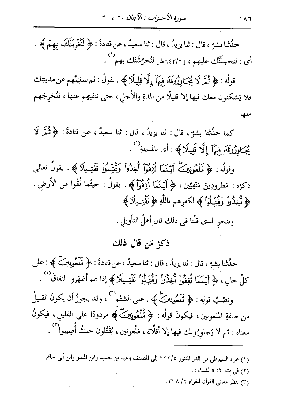 ذِكْرُ مَنْ قَالَ ذَلِكَ: حَدَّثَنَا بِشْرٌ، قَالَ: ثنا يَزِيدُ، قَالَ: ثنا سَعِيدٌ، عَنْ قَتَادَةَ، {مَلْعُونِينَ} [الأحزاب: 61] «عَلَى كُلِّ حَالٍ» {§أَيْنَمَا ثُقِفُوا} [الأحزاب: 61] أُخِذُوا {وَقُتِّلُوا تَقْتِيلًا} [الأحزاب: 61] «إِذَا هُمْ أَظْهَرُوا النِّفَاقَ» وَنَصَبَ قَوْلَهُ: {مَلْعُونِينَ} [الأحزاب: 61] عَلَى الشَّتْمِ، وَقَدْ يَجُوزُ أَنْ يَكُونَ الْقَلِيلُ مِنْ صِفَةِ الْمَلْعُونِينَ، فَيَكُونُ قَوْلُهُ مَلْعُونِينَ مَرْدُودًا عَلَى الْقَلِيلِ، فَيَكُونُ مَعْنَاهُ: ثُمَّ لَا يُجَاوِرُونَكَ فِيهَا إِلَّا أَقِلَّاءَ مَلْعُونِينَ يُقَتَّلُونَ حَيْثُ أُصِيبُوا