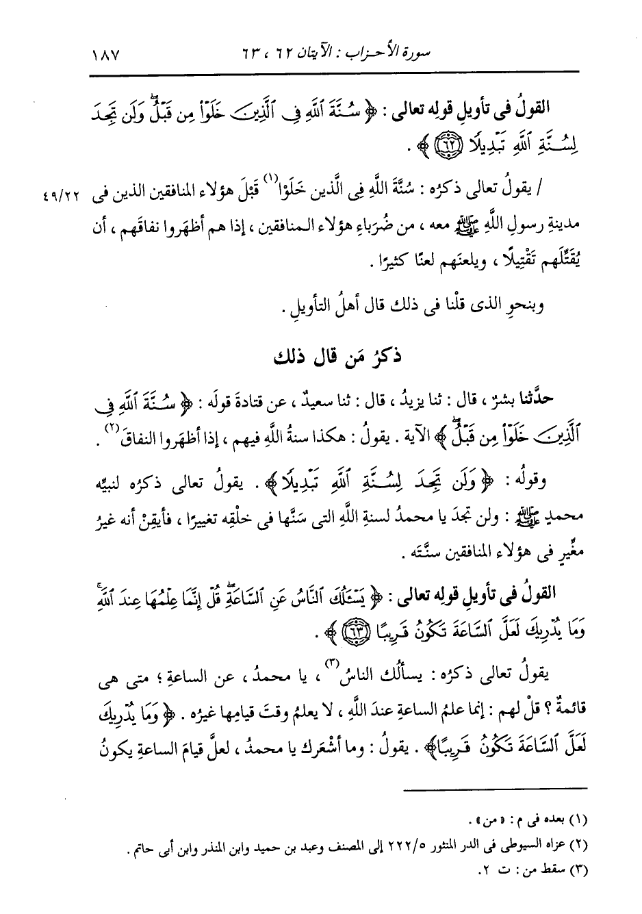 §الْقَوْلُ فِي تَأْوِيلِ قَوْلِهِ تَعَالَى: {سُنَّةَ اللَّهِ فِي الَّذِينَ خَلَوْا} [الأحزاب: 62] مِنْ قَبْلُ وَلَنْ تَجِدَ لِسُنَّةِ اللَّهِ تَبْدِيلًا يَقُولُ تَعَالَى ذِكْرُهُ: {سُنَّةَ اللَّهِ فِي الَّذِينَ خَلَوْا} [الأحزاب: 38] مِنْ قَبْلُ هَؤُلَاءِ الْمُنَافِقِينَ الَّذِينَ فِي مَدِينَةِ رَسُولِ اللَّهِ صَلَّى اللهُ عَلَيْهِ وَسَلَّمَ مَعَهُ مِنْ ضُرَبَاءِ هَؤُلَاءِ الْمُنَافِقِينَ، إِذَا هُمْ أَظْهَرُوا نِفَاقَهُمْ أَنْ يَقْتُلُهُمْ تَقْتِيلًا، وَيَلْعَنُهُمْ لَعْنًا كَثِيرًا وَبِنَحْوِ الَّذِي قَوْلُنَا فِي ذَلِكَ قَالَ أَهْلُ التَّأْوِيلِ