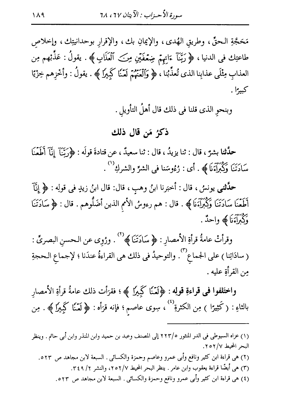 حَدَّثَنِي يُونُسُ، قَالَ: أَخْبَرَنَا ابْنُ وَهْبٍ، قَالَ: قَالَ ابْنُ زَيْدٍ، فِي قَوْلِهِ: {§إِنَّا أَطَعْنَا سَادَتَنَا وَكُبَرَاءَنَا} [الأحزاب: 67] قَالَ: " هُمْ رُءُوسُ الْأُمَمِ الَّذِينَ أَضَلُّوهُمْ، قَالَ: سَادَتُنَا وَكُبَرَاؤُنَا وَاحِدٌ " وَقَرَأَتْ عَامَّةُ قُرَّاءِ الْأَمْصَارِ: {سَادَتَنَا} [الأحزاب: 67] وَرُوِيَ عَنِ الْحَسَنِ الْبَصْرِيِّ: (سَادَاتِنَا) عَلَى الْجِمَاعِ، وَالتَّوْحِيدُ فِي ذَلِكَ هِيَ الْقِرَاءَةُ عِنْدَنَا، لِإِجْمَاعِ الْحِجَّةِ مِنَ الْقُرَّاءِ عَلَيْهِ وَاخْتَلَفُوا فِي قِرَاءَةِ قَوْلِهِ: {لَعْنًا كَبِيرًا} [الأحزاب: 68] فَقَرَأَتْ ذَلِكَ عَامَّةُ قُرَّاءِ الْأَمْصَارِ بِالثَّاءِ: كَثِيرًا مِنَ الْكَثْرَةِ، سِوَى عَاصِمٍ، فَإِنَّهُ قَرَأَهُ {لَعْنًا كَبِيرًا} [الأحزاب: 68] مِنَ -[190]- الْكِبْرِ وَالْقِرَاءَةُ فِي ذَلِكَ عِنْدَنَا بِالثَّاءِ لِإِجْمَاعِ الْحِجَّةِ مِنَ الْقُرَّاءِ عَلَيْهَا