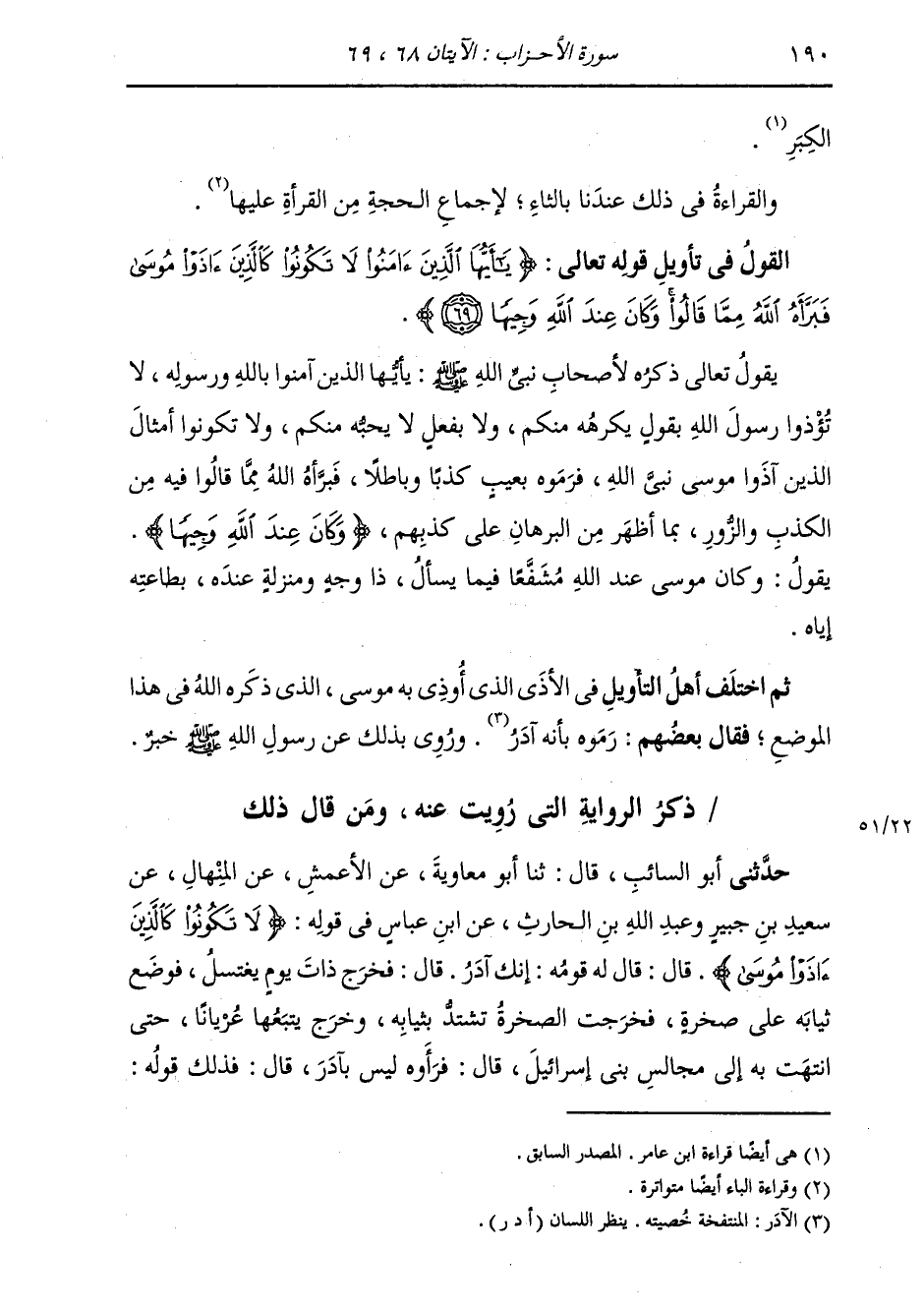 §الْقَوْلُ فِي تَأْوِيلِ قَوْلِهِ تَعَالَى: {يَا أَيُّهَا الَّذِينَ آمَنُوا لَا تَكُونُوا كَالَّذِينَ آذَوْا مُوسَى فَبَرَّأَهُ اللَّهُ مِمَّا قَالُوا وَكَانَ عِنْدَ اللَّهِ وَجِيهًا} [الأحزاب: 69] يَقُولُ تَعَالَى ذِكْرُهُ لِأَصْحَابِ نَبِيِّ اللَّهِ صَلَّى اللهُ عَلَيْهِ وَسَلَّمَ: يَا أَيُّهَا الَّذِينَ آمَنُوا بِاللَّهِ وَرَسُولِهِ لَا تُؤْذُوا رَسُولَ اللَّهِ بِقَوْلٍ يَكْرَهُهُ مِنْكُمْ، وَلَا بِفِعْلٍ لَا يُحِبُّهُ مِنْكُمْ، وَلَا تَكُونُوا أَمْثَالَ الَّذِينَ آذَوْا مُوسَى نَبِيَّ اللَّهِ، فَرَمُوهُ بِعَيْبٍ كَذِبًا وَبَاطِلًا {فَبَرَّأَهُ اللَّهُ مِمَّا قَالُوا} [الأحزاب: 69] فِيهِ مِنَ الْكَذِبِ وَالزُّورِ بِمَا أَظْهَرَ مِنَ الْبُرْهَانِ عَلَى كِذْبِهِمْ {وَكَانَ عِنْدَ اللَّهِ وَجِيهًا} [الأحزاب: 69] يَقُولُ: وَكَانَ مُوسَى عِنْدَ اللَّهِ مُشَفَّعًا فِيمَا يَسْأَلُ، ذَا وَجْهٍ وَمَنْزِلَةٍ عِنْدَهُ بِطَاعَتِهِ إِيَّاهُ ثُمَّ اخْتَلَفَ أَهْلُ التَّأْوِيلِ فِي الْأَذَى الَّذِي أُوذِيَ بِهِ مُوسَى الَّذِي ذَكَرَهُ اللَّهُ فِي هَذَا الْمَوْضِعِ، فَقَالَ بَعْضُهُمْ: رَمَوْهُ بِأَنَّهُ آدَرُ وَرَوَى بِذَلِكَ عَنْ رَسُولِ اللَّهِ صَلَّى اللهُ عَلَيْهِ وَسَلَّمَ خَبَرًا ذَكَرَ الرِّوَايَةَ الَّتِي رُوِيَتْ عَنْهُ
