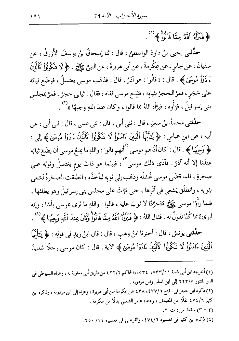 حَدَّثَنِي مُحَمَّدُ بْنُ سَعْدٍ، قَالَ: ثني أَبِي، قَالَ: ثني عَمِّي، قَالَ: ثني أَبِي، عَنْ أَبِيهِ، عَنِ ابْنِ عَبَّاسٍ {§يَا أَيُّهَا الَّذِينَ آمَنُوا لَا تَكُونُوا كَالَّذِينَ آذَوْا مُوسَى} [الأحزاب: 69] . . . إِلَى {وَجِيهًا} [آل عمران: 45] قَالَ: " كَانَ أَذَاهُمْ مُوسَى أَنَّهُمْ قَالُوا: وَاللَّهِ مَا يَمْنَعُ مُوسَى أَنْ يَضَعَ ثِيَابَهُ عِنْدَنَا إِلَّا أَنَّهُ آدَرُ، فَآذَى ذَلِكَ مُوسَى؛ فَبَيْنَمَا هُوَ ذَاتَ يَوْمٍ يَغْتَسِلُ وَثَوْبُهُ عَلَى صَخْرَةٍ؛ فَلَمَّا قَضَى مُوسَى غُسْلَهُ وَذَهَبَ إِلَى ثَوْبِهِ لِيَأْخُذَهُ، انْطَلَقَتِ الصَّخْرَةُ تَسْعَى بِثَوْبِهِ، وَانْطَلَقَ يَسْعَى فِي إِثْرِهَا حَتَّى مَرَّتْ عَلَى مَجْلِسِ بَنِي إِسْرَائِيلَ وَهُوَ يَطْلُبُهَا؛ فَلَمَّا رَأَوْا مُوسَى صَلَّى اللهُ عَلَيْهِ وَسَلَّمَ مُتَجَرِّدًا لَا ثَوْبَ عَلَيْهِ، قَالُوا: وَلِلَّهِ مَا نَرَى بِمُوسَى بَأْسًا، وَإِنَّهُ لَبَرِيءٌ مِمَّا كُنَّا نَقُولُ لَهُ، فَقَالَ اللَّهُ: {فَبَرَّأَهُ اللَّهُ مِمَّا قَالُوا وَكَانَ عِنْدَ اللَّهِ وَجِيهًا} [الأحزاب: 69]