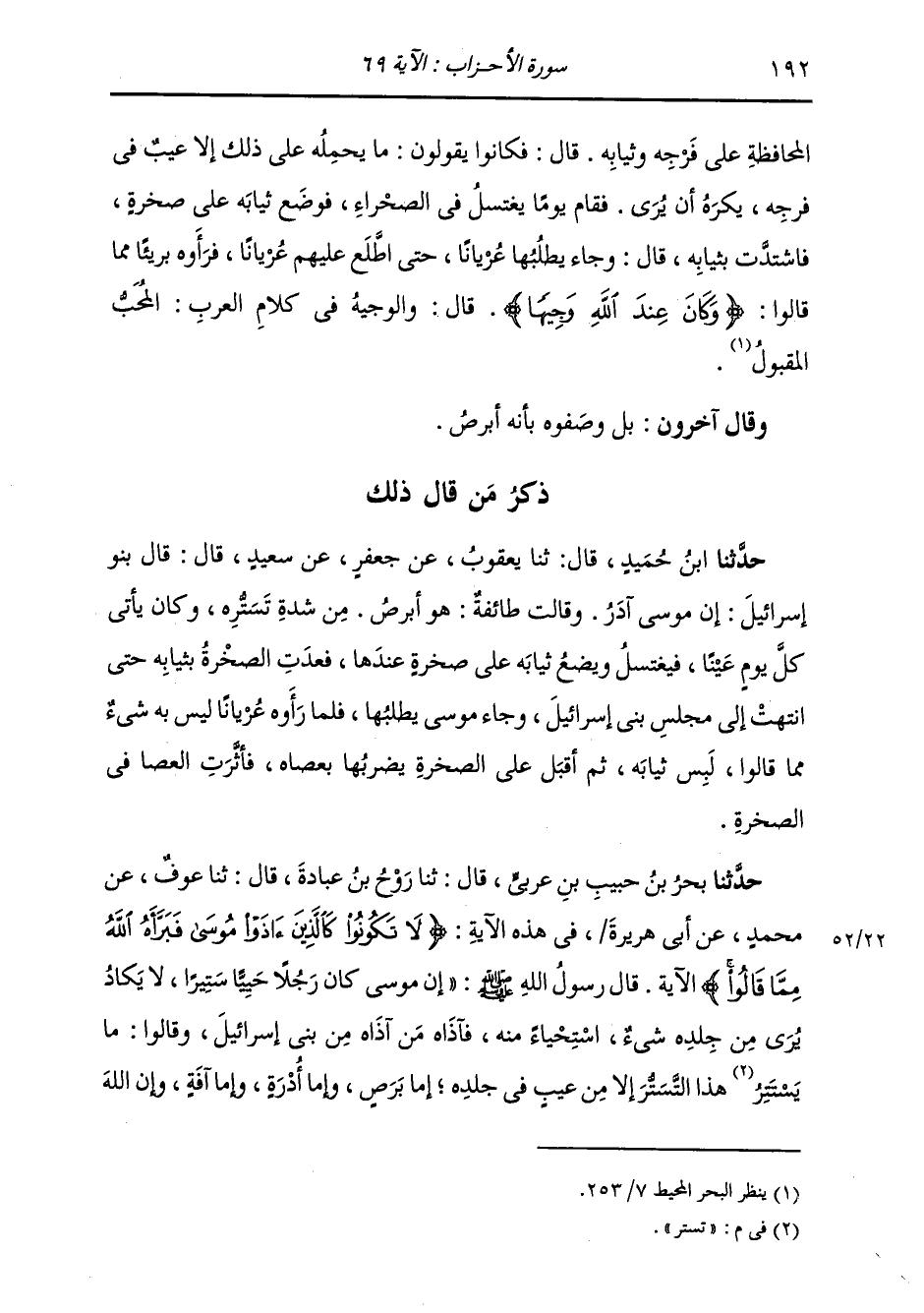 حَدَّثَنَا بَحْرُ بْنُ حَبِيبِ بْنِ عَرَبِيٍّ، قَالَ: ثنا رَوْحُ بْنُ عِبَادَةَ، قَالَ: ثنا عَوْفٌ، عَنْ مُحَمَّدٍ، عَنْ أَبِي هُرَيْرَةَ فِي هَذِهِ الْآيَةِ {لَا تَكُونُوا كَالَّذِينَ آذَوْا مُوسَى فَبَرَّأَهُ اللَّهُ مِمَّا قَالُوا} [الأحزاب: 69] . . . الْآيَةَ، قَالَ رَسُولُ اللَّهِ صَلَّى اللهُ عَلَيْهِ وَسَلَّمَ: " §إِنَّ مُوسَى كَانَ رَجُلًا حَيِيًّا سِتِّيرًا، لَا يَكَادُ يُرَى مِنْ جِلْدِهِ شَيْءٌ اسْتِحْيَاءً مِنْهُ، فَآذَاهُ مَنْ آذَاهُ مِنْ بَنِي إِسْرَائِيلَ، وَقَالُوا: مَا تُسَتِّرُ هَذَا التَّسَتُّرَ إِلَّا مِنْ عَيْبٍ فِي جِلْدِهِ، إِمَّا بَرَصٌ، وَإِمَّا أُدْرَةٌ، وَإِمَّا آفَةٌ، وَإِنَّ اللَّهَ -[193]- أَرَادَ أَنْ يُبَرِّئَهُ مِمَّا قَالُوا، وَإِنَّ مُوسَى خَلَا يَوْمًا وَحْدَهُ، فَوَضَعَ ثِيَابَهُ عَلَى حَجَرٍ، ثُمَّ اغْتَسَلَ؛ فَلَمَّا فَرَغَ مِنْ غُسْلِهِ أَقْبَلَ عَلَى ثَوْبِهِ لِيَأْخُذَهُ، وَإِنَّ الْحَجَرَ عَدَا بِثَوْبِهِ، فَأَخَذَ مُوسَى عَصَا وَطَلَبَ الْحَجَرَ، وَجَعَلَ يَقُولُ: ثَوْبِي حُجَرُ، حَتَّى انْتَهَى إِلَى مَلَإٍ مِنْ بَنِي إِسْرَائِيلَ، فَرَأَوْهُ عُرْيَانًا كَأَحْسَنِ النَّاسِ خَلْقًا، وَبَرَّأَهُ اللَّهُ مِمَّا قَالُوا، وَإِنَّ الْحَجَرَ قَامَ، فَأَخَذَ ثَوْبَهُ وَلَبِسَهُ، فَطَفِقَ بِالْحَجَرِ ضَرْبًا بِذَلِكَ، فَوَاللَّهِ إِنَّ فِي الْحَجَرِ لَنَدَبًا مِنْ أَثَرِ ضَرْبِهِ ثَلَاثًا أَوْ أَرْبَعًا أَوْ خَمْسًا "