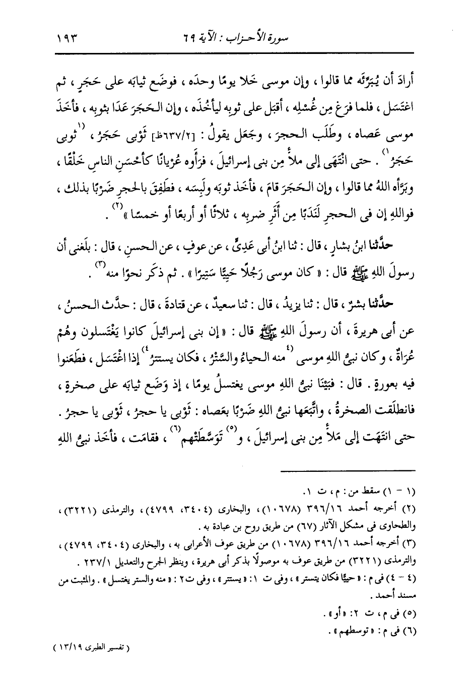 حَدَّثَنَا بِشْرٌ، قَالَ: ثنا يَزِيدُ، قَالَ: ثنا سَعِيدٌ، عَنْ قَتَادَةَ، قَالَ: حَدَّثَ الْحَسَنُ، عَنْ أَبِي هُرَيْرَةَ، أَنَّ رَسُولَ اللَّهِ صَلَّى اللهُ عَلَيْهِ وَسَلَّمَ قَالَ: «إِنَّ بَنِي إِسْرَائِيلَ §كَانُوا يَغْتَسِلُونَ وَهُمْ عُرَاةٌ، وَكَانَ نَبِيُّ اللَّهِ مُوسَى حَيِيًّا، فَكَانَ يَتَسَتَّرُ إِذَا اغْتَسَلَ، فَطَعَنُوا فِيهِ بِعَوْرَةٍ» ، قَالَ: " فَبَيْنَا نَبِيُّ اللَّهِ يَغْتَسِلُ يَوْمًا، إِذْ وَضَعَ ثِيَابَهُ عَلَى صَخْرَةٍ، فَانْطَلَقَتِ الصَّخْرَةُ وَأَتْبَعَهَا نَبِيُّ اللَّهِ ضَرْبًا بِعَصَاهُ: ثَوْبِي يَا حَجَرُ، ثَوْبِي يَا حَجَرُ، حَتَّى انْتَهَتْ إِلَى مَلَإٍ مِنْ بَنِي إِسْرَائِيلَ، أَوْ تَوَسَّطَهُمْ، فَقَامَتْ، فَأَخَذَ نَبِيُّ اللَّهِ -[194]- ثِيَابَهُ، فَنَظَرُوا إِلَى أَحْسَنِ النَّاسِ خَلْقًا، وَأَعْدَلِهِ مُرُوءَةً، فَقَالَ الْمَلَأُ: قَاتَلَ اللَّهُ أَفَّاكِي بَنِي إِسْرَائِيلَ، فَكَانَتْ بَرَاءَتَهُ الَّتِي بَرَّأَهُ اللَّهُ مِنْهَا " وَقَالَ آخَرُونَ: بَلْ كَانَ أَذَاهُمْ إِيَّاهُ ادِّعَاءَهُمْ عَلَيْهِ قَتْلَ هَارُونَ أَخِيهِ