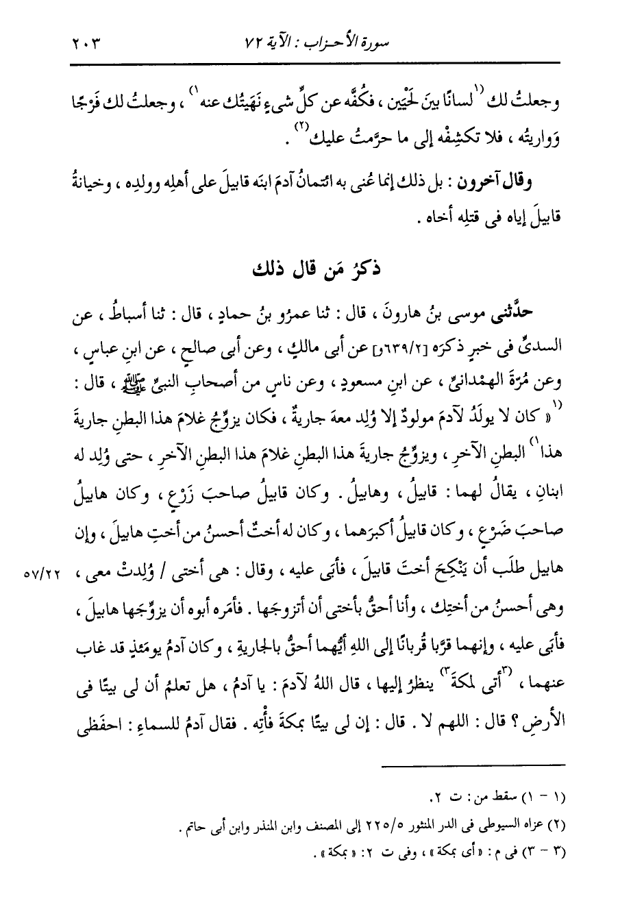 ذِكْرُ مَنْ قَالَ ذَلِكَ: حَدَّثَنِي مُوسَى بْنُ هَارُونَ، قَالَ: ثنا عَمْرُو بْنُ حَمَّادٍ، قَالَ: ثنا أَسْبَاطٌ، عَنِ السُّدِّيِّ، فِي خَبَرٍ ذَكَرَهُ عَنْ أَبِي مَالِكٍ، وَعَنْ أَبِي صَالِحٍ، عَنِ ابْنِ عَبَّاسٍ، وَعَنْ مُرَّةَ الْهَمْدَانِيُّ، عَنِ ابْنِ مَسْعُودٍ، وَعَنْ نَاسٍ، مِنْ أَصْحَابِ النَّبِيِّ صَلَّى اللهُ عَلَيْهِ وَسَلَّمَ قَالَ: " §كَانَ لَا يُولَدُ لِآدَمَ مَوْلُودٌ إِلَّا وُلِدَ مَعَهُ جَارِيَةٌ، فَكَانَ يُزَوِّجُ غُلَامَ هَذَا الْبَطْنِ جَارِيَةَ هَذَا الْبَطْنِ الْآخَرِ، وَيُزَوَّجُ جَارِيَةَ هَذَا الْبَطْنِ غُلَامَ هَذَا الْبَطْنِ الْآخَرِ، حَتَّى وُلِدَ لَهُ اثْنَانِ، يُقَالُ لَهُمَا قَابِيلُ، وَهَابِيلُ؛ وَكَانَ قَابِيلُ صَاحِبَ زَرْعٍ، وَكَانَ هَابِيلُ صَاحِبَ ضَرْعٍ، وَكَانَ قَابِيلُ أَكْبَرَهُمَا، وَكَانَ لَهُ أُخْتٌ أَحْسَنُ مِنْ أُخْتِ هَابِيلَ، وَإِنَّ هَابِيلَ طَلَبَ أَنْ يَنْكِحَ أُخْتَ قَابِيلَ، فَأَبَى عَلَيْهِ وَقَالَ: هِيَ أُخْتِي وُلِدَتْ مَعِي، وَهِيَ أَحْسَنُ مِنْ أُخْتِكَ، وَأَنَا أَحَقُّ أَنْ أَتَزَوَّجَهَا، فَأَمَرَهُ أَبُوهُ أَنْ يُزَوِّجَهَا هَابِيلَ فَأَبَى، وَإِنَّهُمَا قَرَّبَا قُرْبَانًا إِلَى اللَّهِ أَيُّهُمَا أَحَقُّ بِالْجَارِيَةِ، وَكَانَ آدَمُ يَوْمَئِذٍ قَدْ غَابَ عَنْهُمَا، أَيْ بِمَكَّةَ يَنْظُرُ إِلَيْهَا، قَالَ اللَّهُ لِآدَمَ: يَا آدَمُ هَلْ تَعْلَمُ أَنَّ لِيَ بَيْتًا فِي الْأَرْضِ؟ قَالَ: اللَّهُمَّ لَا، قَالَ: إِنَّ لِي بَيْتًا بِمَكَّةَ فَأْتِهِ، فَقَالَ آدَمُ لِلسَّمَاءِ: احْفَظِي -[204]- وَلَدِي بِالْأَمَانَةِ، فَأَبَتْ؛ وَقَالَ لِلْأَرْضِ، فَأَبَتْ؛ فَقَالَ لِلْجِبَالِ، فَأَبَتْ؛ فَقَالَ لِقَابِيلَ، فَقَالَ: نَعَمْ، تَذْهَبُ وَتَرْجِعُ وَتَجِدُ أَهْلَكَ كَمَا يَسُرُّكَ؛ فَلَمَّا انْطَلَقَ آدَمُ وَقَرَّبَا قُرْبَانًا، وَكَانَ قَابِيلُ يَفْخَرُ عَلَيْهِ فَيَقُولُ: أَنَا أَحَقُّ بِهَا مِنْكَ، هِيَ أُخْتِي، وَأَنَا أَكْبَرُ مِنْكَ، وَأَنَا وَصِيُّ وَالِدِي؛ فَلَمَّا قَرَّبَا، قَرَّبَ هَابِيلُ جَذَعَةً سَمِينَةً، وَقَرَّبَ قَابِيلُ حِزْمَةَ سُنْبُلٍ، فَوَجَدَ فِيهَا سُنْبُلَةً عَظِيمَةً، فَفَرَكَهَا فَأَكَلَهَا، فَنَزَلَتِ النَّارَ فَأَكَلَتْ قُرْبَانَ هَابِيلَ، وَتَرَكَتْ قُرْبَانَ قَابِيلَ، فَغَضِبَ وَقَالَ: لَأَقْتُلَنَّكَ حَتَّى لَا تَنْكِحَ أُخْتِي، فَقَالَ هَابِيلُ {إِنَّمَا يَتَقَبَّلُ اللَّهُ مِنَ الْمُتَّقِينَ لَئِنْ بَسَطْتَ إِلَيَّ يَدَكَ لِتَقْتُلَنِي مَا أَنَا بِبَاسِطٌ يَدِي إِلَيْكَ لِأَقْتُلَكَ إِنِّي أَخَافُ اللَّهَ رَبَّ الْعَالَمِينَ} [المائدة: 28] إِلَى قَوْلِهِ: {فَطَوَّعَتْ لَهُ نَفْسُهُ قَتْلَ أَخِيهِ} [المائدة: 30] فَطَلَبَهُ لِيَقْتُلَهُ، فَرَاغَ الْغُلَامُ مِنْهُ فِي رُؤُوسِ الْجِبَالَ؛ وَأَتَاهُ يَوْمًا مِنَ الْأَيَّامِ، وَهُوَ يَرْعَى غَنَمَهُ فِي جَبَلٍ، وَهُوَ نَائِمٌ، فَرَفَعَ صَخْرَةً، فَشَدَخَ بِهَا رَأْسَهُ، فَمَاتَ، وَتَرَكَهُ بِالْعَرَاءِ، وَلَا يَعْلَمُ كَيْفَ يُدْفَنْ، فَبَعَثَ اللَّهُ غُرَابَيْنِ أَخَوَيْنِ فَاقْتَتَلَا، فَقَتَلَ أَحَدُهُمَا صَاحِبَهُ، فَحَفَرَ لَهُ، ثُمَّ حَثَا عَلَيْهِ؛ فَلَمَّا رَآهُ قَالَ: {يَا وَيْلَتَا أَعَجَزْتُ أَنْ أَكُونَ مِثْلَ هَذَا الْغُرَابِ فَأُوَارِي سَوْأَةَ أَخِي} فَهُوَ قَوْلُ اللَّهِ تَبَارَكَ وَتَعَالَى: {فَبَعَثَ اللَّهُ غُرَابًا يَبْحَثُ فِي الْأَرْضِ لِيُرِيَهُ كَيْفَ يُوَارِي سَوْأَةَ أَخِيهِ} فَرَجَعَ آدَمُ فَوَجَدَ ابْنَهُ قَدْ قَتَلَ أَخَاهُ، فَذَلِكَ حِينَ يَقُولُ: {إِنَّا عَرَضْنَا الْأَمَانَةَ عَلَى السَّمَوَاتِ وَالْأَرْضِ وَالْجِبَالِ} . . . إِلَى آخِرِ الْآيَةِ " وَأَوْلَى الْأَقْوَالِ فِي ذَلِكَ بِالصَّو