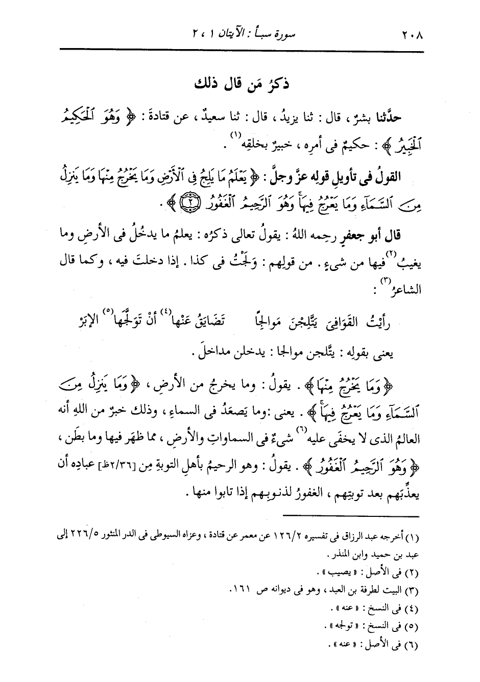 ذِكْرُ مَنْ قَالَ ذَلِكَ: حَدَّثَنَا بِشْرٌ، قَالَ: ثنا يَزِيدُ، قَالَ: ثنا سَعِيدٌ، عَنْ قَتَادَةَ {§وَهُوَ الْحَكِيمُ الْخَبِيرُ} [سبأ: 1] «حَكِيمٌ فِي أَمْرِهِ، خَبِيرٌ بِخَلْقِهِ»