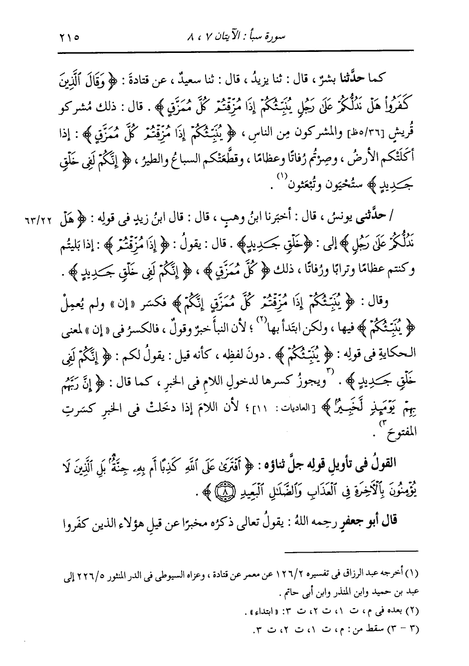 حَدَّثَنِي يُونُسُ، قَالَ: أَخْبَرَنَا ابْنُ وَهْبٍ، قَالَ: قَالَ ابْنُ زَيْدٍ، فِي قَوْلِهِ: {§هَلْ نَدُلُّكُمْ عَلَى رَجُلٍ} [سبأ: 7] إِلَى {خَلْقٍ جَدِيدٍ} [سبأ: 7] قَالَ: يَقُولُ: {إِذَا مُزِّقْتُمْ} [سبأ: 7] «وَإِذَا بُلِيتُمْ وَكُنْتُمْ عِظَامًا وَتُرَابًا وَرُفَاتًا» ذَلِكَ {كُلَّ مُمَزَّقٍ إِنَّكُمْ لَفِي خَلَقٍ جَدِيدٍ} [سبأ: 7] " قَالَ: يُنَبِّئُكُمْ إِنَّكُمْ " فَكَسَرَ إِنَّ وَلَمْ يُعْمِلْ يُنَبِّئُكُمْ فِيهَا، وَلَكِنِ ابْتَدَأَ بِهَا ابْتِدَاءً، لِأَنَّ النَّبَأَ خَبَرٌ وَقَوْلٌ، فَالْكَسْرُ فِي إِنَّ لِمَعْنَى الْحِكَايَةِ فِي قَوْلِهِ: {يُنَبِّئُكُمْ} [الأنعام: 60] دُونَ لَفْظِهِ، كَأَنَّهُ قِيلَ: يَقُولُ لَكُمْ: {إِنَّكُمْ لَفِي خَلْقٍ جَدِيدٍ} [سبأ: 7] "