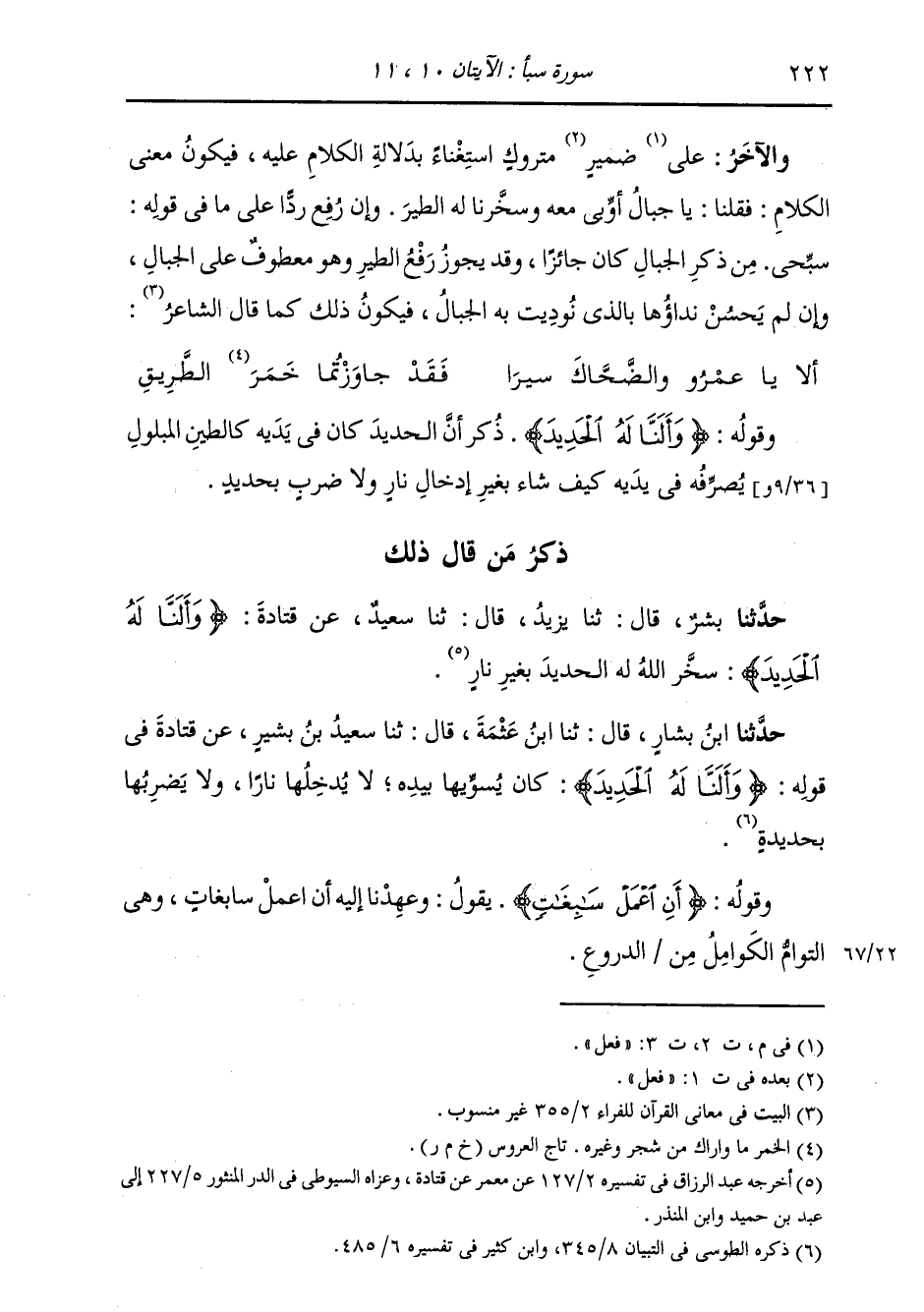 ذِكْرُ مَنْ قَالَ ذَلِكَ: حَدَّثَنَا بِشْرٌ، قَالَ: ثنا يَزِيدُ، قَالَ: ثنا سَعِيدٌ، عَنْ قَتَادَةَ {§وَأَلَنَّا لَهُ الْحَدِيدَ} [سبأ: 10] «سَخَّرَ اللَّهُ لَهُ الْحَدِيدَ بِغَيْرِ نَارٍ»