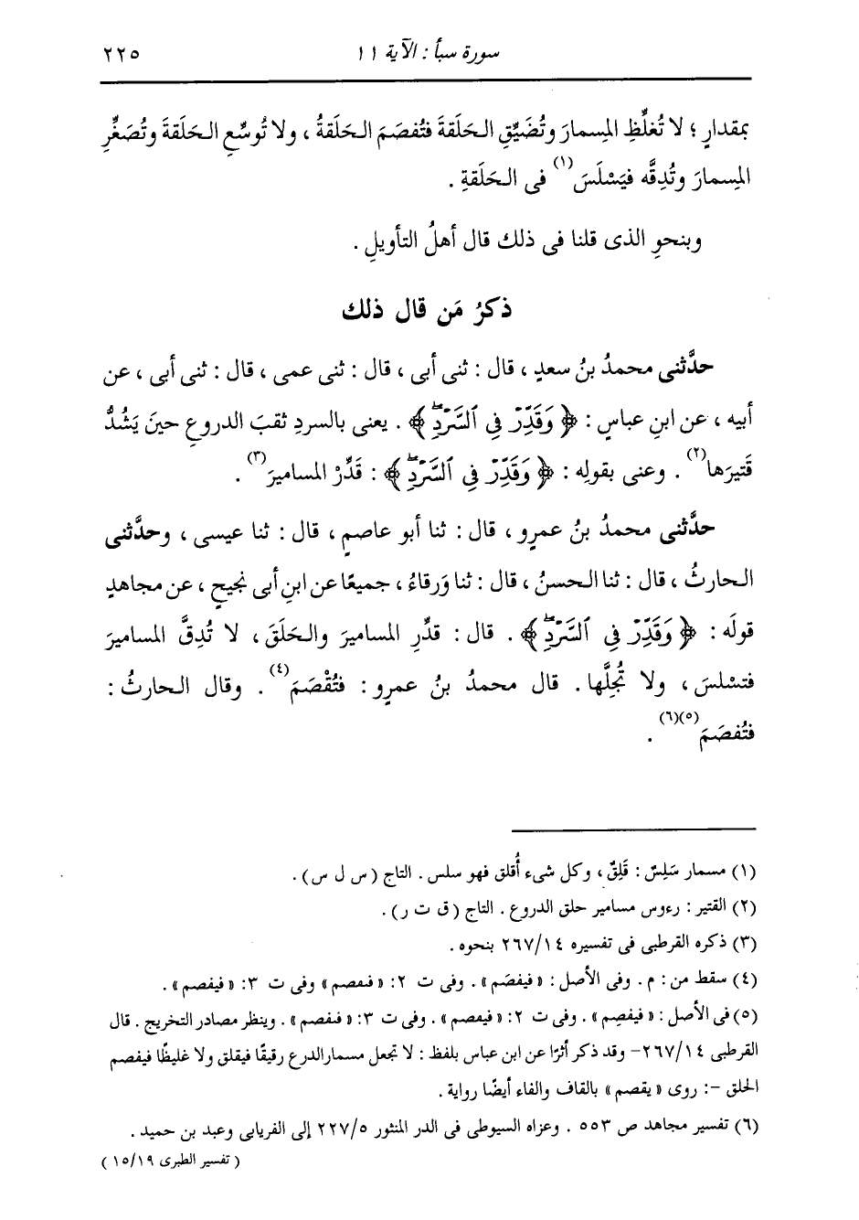 ذِكْرُ مَنْ قَالَ ذَلِكَ: حَدَّثَنِي مُحَمَّدُ بْنُ عَمْرٍو، قَالَ: ثنا أَبُو عَاصِمٍ، قَالَ: ثنا عِيسَى، وَحَدَّثَنِي الْحَارِثُ، قَالَ: ثنا الْحَسَنُ، قَالَ: ثنا وَرْقَاءُ، جَمِيعًا عَنِ ابْنِ أَبِي نَجِيحٍ، عَنْ مُجَاهِدٍ، فِي قَوْلِهِ: {§وَقَدِّرْ فِي السَّرْدِ} [سبأ: 11] قَالَ: «قَدِّرِ الْمَسَامِيرَ وَالْحَلْقَ، لَا تَدُقُّ الْمَسَامِيرَ فَتَسْلَسُ، وَلَا تُجْلِهَا» قَالَ مُحَمَّدُ بْنُ عَمْرٍو، وَقَالَ الْحَارِثُ: فَتُفْصَمُ "