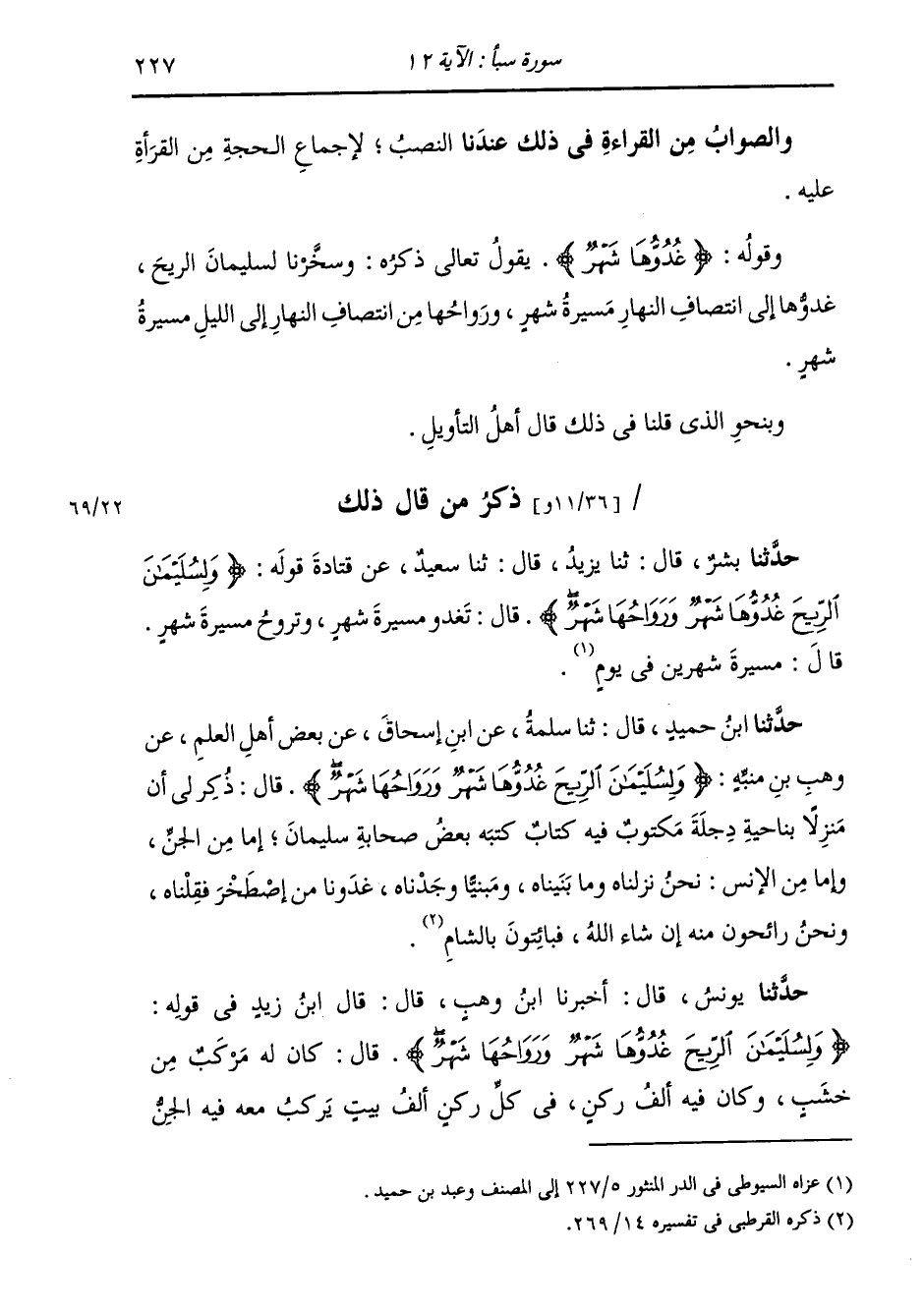 §وَقَوْلُهُ: {غُدُوُّهَا شَهْرٌ} [سبأ: 12] يَقُولُ تَعَالَى ذِكْرُهُ: وَسَخَّرْنَا لِسُلَيْمَانَ الرِّيحَ، غُدُوُّهَا إِلَى انْتِصَافِ النَّهَارِ مَسِيرَةُ شَهْرٍ، وَرَوَاحُهَا مِنَ انْتِصَافِ النَّهَارِ إِلَى اللَّيْلِ مَسِيرَةُ شَهْرٍ وَبِنَحْوِ الَّذِي قُلْنَا فِي ذَلِكَ قَالَ أَهْلُ التَّأْوِيلِ