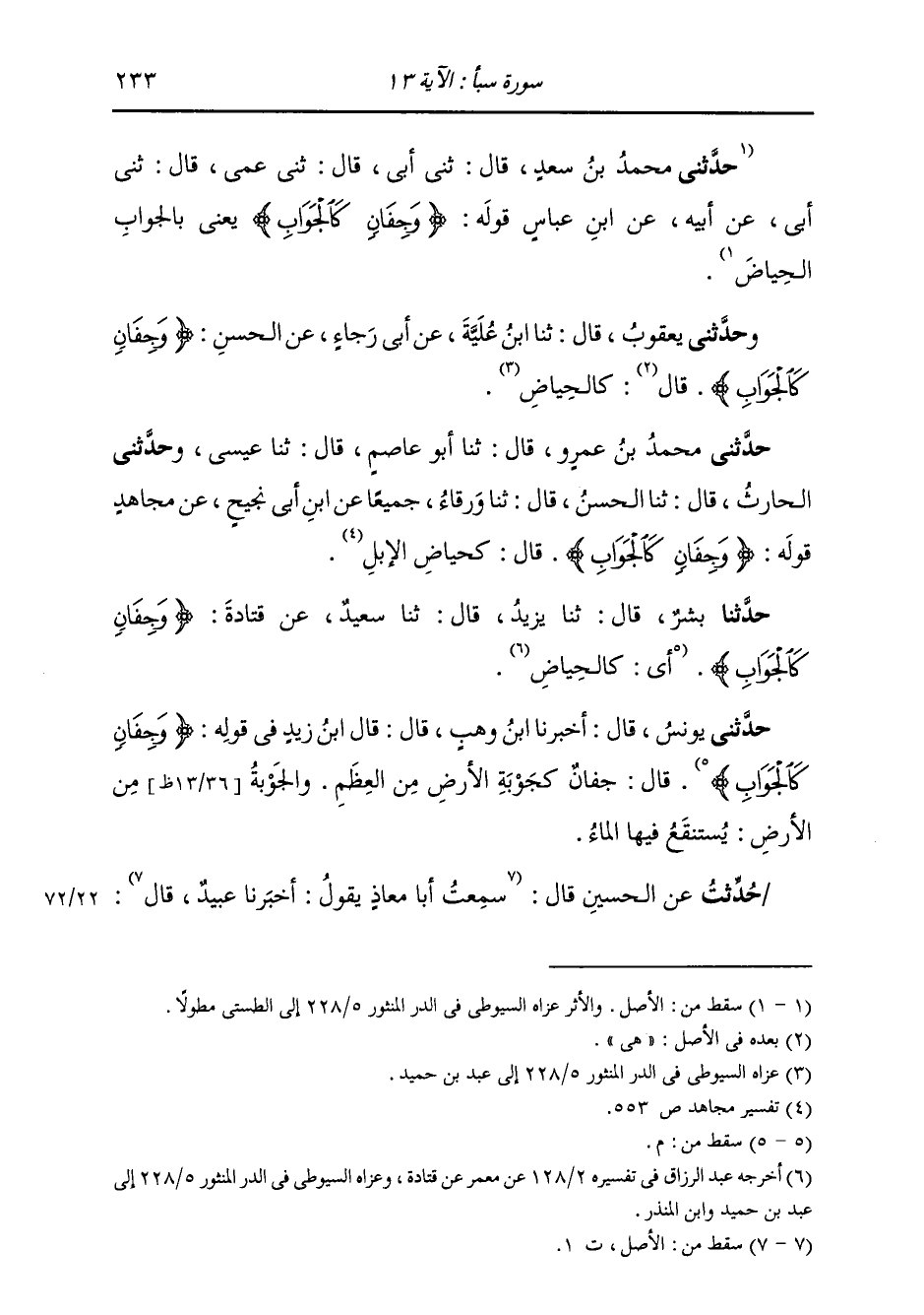 حَدَّثَنِي مُحَمَّدُ بْنُ سَعْدٍ، قَالَ: ثني أَبِي، قَالَ: ثني عَمِّي، قَالَ: ثَنَّى أَبِي، عَنْ أَبِيهِ، عَنِ ابْنِ عَبَّاسٍ، قَوْلُهُ {§وَجِفَانٍ كَالْجَوَابِ} [سبأ: 13] " يَعْنِي بِالْجَوَابِ: الْحِيَاضَ "