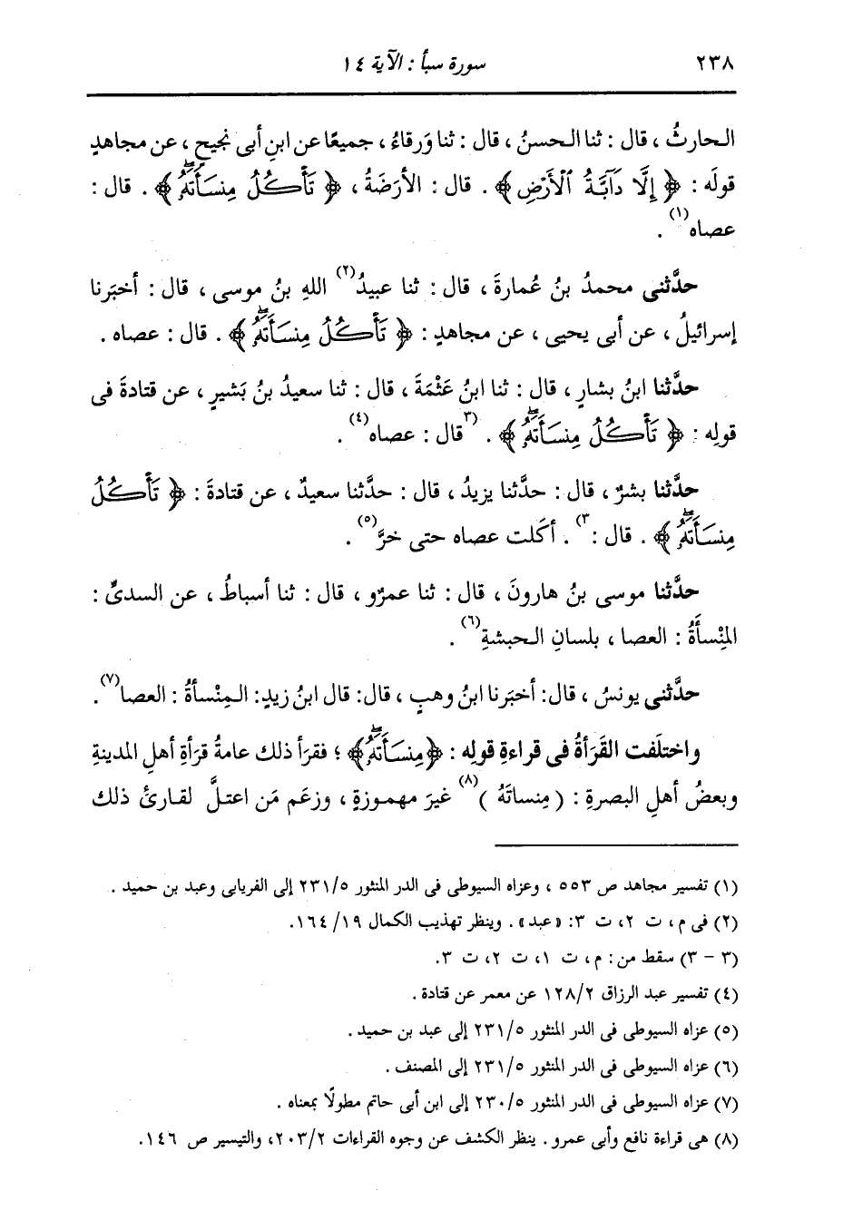 حَدَّثَنَا مُوسَى بْنُ هَارُونَ، قَالَ: ثنا عَمْرٌو، قَالَ: ثنا أَسْبَاطٌ، عَنِ السُّدِّيِّ: " §الْمَنْسَأَةُ: «الْعَصَا بِلِسَانِ الْحَبَشَةِ»