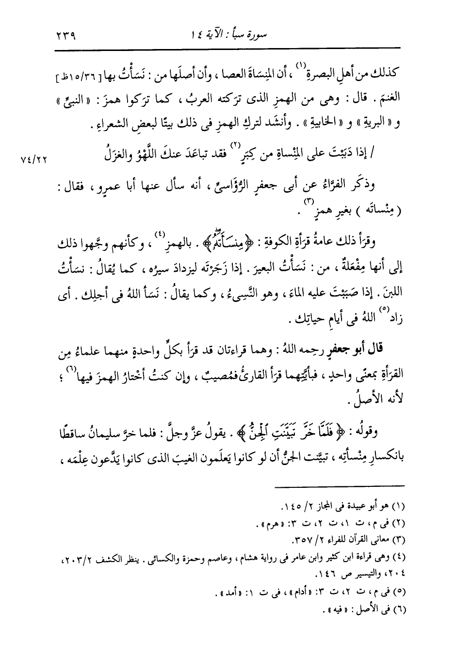 وَذَكَرَ الْفَرَّاءُ عَنْ أَبِي جَعْفَرٍ الرُّوَاسِيِّ، أَنَّهُ سَأَلَ عَنْهَا أَبَا عَمْرٍو، فَقَالَ: مِنْسَأَتَهُ بِغَيْرِ هَمْزٍ وَقَرَأَ ذَلِكَ عَامَّةُ قُرَّاءِ الْكُوفَةِ: {مِنْسَأَتَهُ} [سبأ: 14] بِالْهَمْزِ، وَكَأَنَّهُمْ وَجَّهُوا ذَلِكَ إِلَى أَنَّهَا مِفْعَلَةٌ، مِنْ نَسَأْتُ الْبَعِيرَ: إِذَا زَجَرْتُهُ لِيَزْدَادَ سَيْرَهُ، كَمَا يُقَالُ: نَسَأْتُ اللَّبَنَ: إِذَا صَبَبْتَ عَلَيْهِ الْمَاءَ، وَهُوَ النَّسِيءُ. وَكَمَا يُقَالُ: نَسَأَ اللَّهُ فِي أَجَلِكَ أَيْ أَدَامَ اللَّهُ فِي أَيَّامِ حَيَاتِكَ قَالَ أَبُو جَعْفَرٍ: وَهُمَا قِرَاءَتَانِ قَدْ قَرَأَ بِكُلِّ وَاحِدَةٍ مِنْهُمَا عُلَمَاءُ مِنَ الْقُرَّاءِ بِمَعْنًى وَاحِدٍ، فَبِأَيَّتِهِمَا قَرَأَ الْقَارِئُ فَمُصِيبٌ، وَإِنْ كُنْتُ أَخْتَارُ الْهَمْزَ فِيهَا لِأَنَّهُ الْأَصْلُ