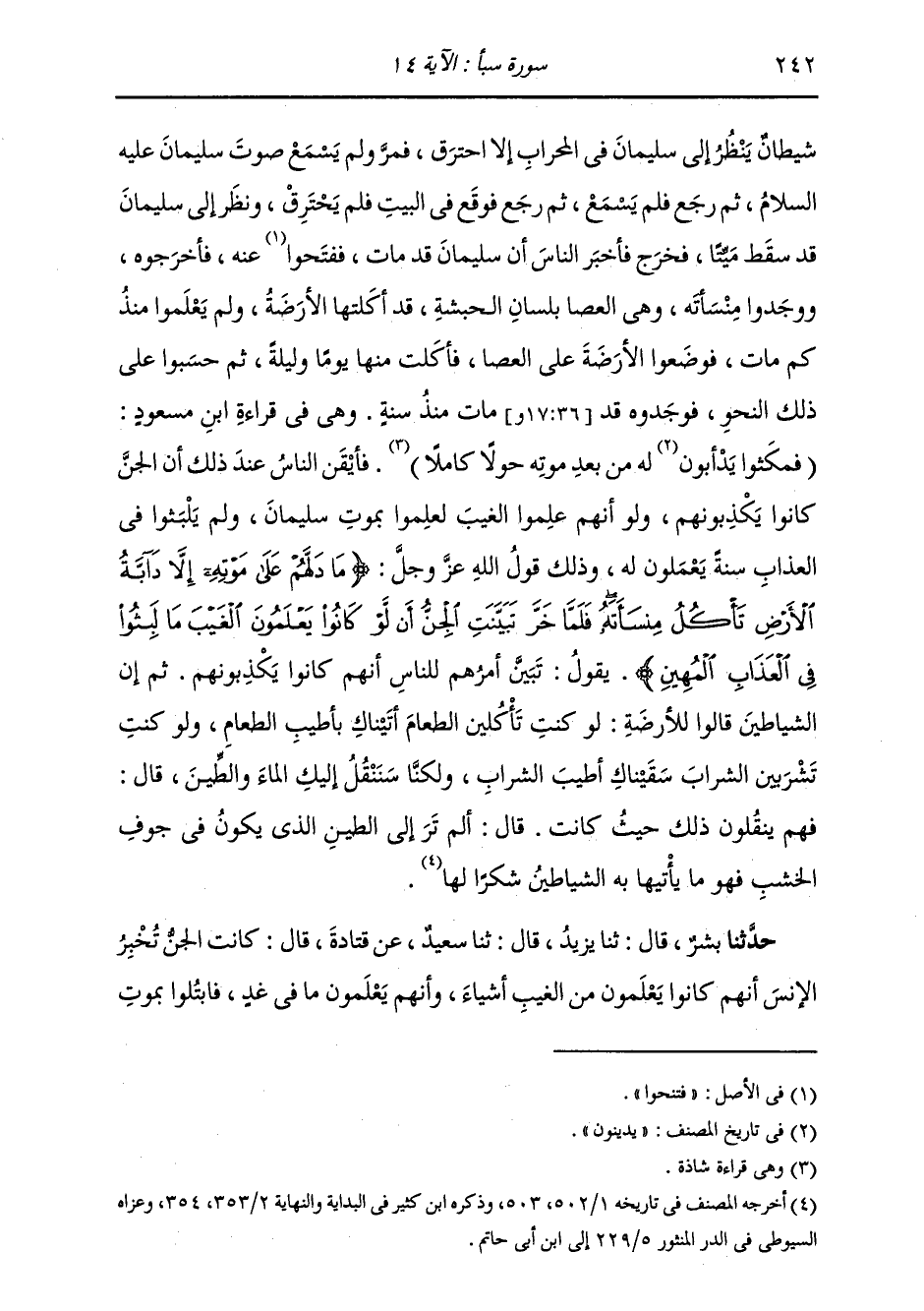 حَدَّثَنَا بِشْرٌ، قَالَ: ثنا يَزِيدُ، قَالَ: ثنا سَعِيدٌ، عَنْ قَتَادَةَ، قَالَ: " §كَانَتِ الْجِنُّ تُخْبِرُ الْإِنْسَ أَنَّهُمْ كَانُوا يَعْلَمُونَ مِنَ الْغَيْبِ أَشْيَاءَ، وَأَنَّهُمْ يَعْلَمُونَ مَا فِي غَدٍ، فَابْتُلُوا بِمَوْتِ -[243]- سُلَيْمَانَ، فَمَاتَ، فَلَبِثَ سَنَةً عَلَى عَصَاهُ وَهُمْ لَا يَشْعُرُونَ بِمَوْتِهِ، وَهُمْ مُسَخَّرُونَ تِلْكَ السَّنَةَ يَعْمَلُونَ دَائِبِينَ {فَلَمَّا خَرَّ تَبَيَّنَتِ الْجِنُّ أَنْ لَوْ كَانُوا يَعْلَمُونَ الْغَيْبَ مَا لَبِثُوا فِي الْعَذَابِ الْمُهِينِ} [سبأ: 14] وَلَقَدْ لَبِثُوا يَدْأَبُونَ، وَيَعْمَلُونَ لَهُ حَوْلًا "