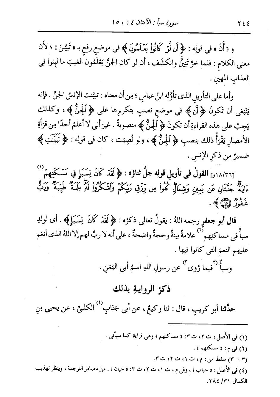 §الْقَوْلُ فِي تَأْوِيلِ قَوْلِهِ تَعَالَى: {لَقَدْ كَانَ لِسَبَإٍ فِي مَسْكَنِهِمْ آيَةٌ جَنَّتَانِ عَنْ يَمِينٍ وَشِمَالٍ كُلُوا مِنْ رِزْقِ رَبِّكُمْ وَاشْكُرُوا لَهُ بَلْدَةٌ طَيِّبَةٌ وَرَبٌّ غَفُورٌ} [سبأ: 15] يَقُولُ تَعَالَى ذِكْرُهُ: لَقَدْ كَانَ لِوَلَدِ سَبَإٍ فِي مَسْكَنِهِمْ عَلَامَةٌ بَيِّنَةٌ، وَحُجَّةٌ وَاضِحَةٌ، عَلَى أَنَّهُ لَا رَبَّ لَهُمْ إِلَّا الَّذِي أَنْعَمَ عَلَيْهِمُ النِّعَمَ الَّتِي كَانُوا فِيهَا وَسَبَأٌ عَنْ رَسُولِ اللَّهِ اسْمُ أَبِي الْيَمَنِ