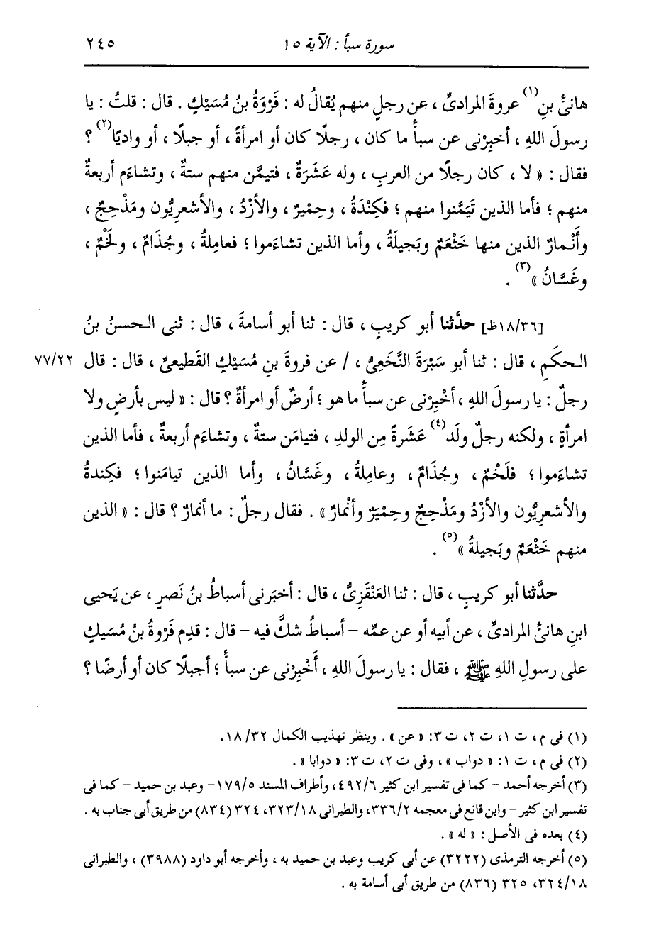 حَدَّثَنَا أَبُو كُرَيْبٍ، قَالَ: ثنا أَبُو أُسَامَةَ، قَالَ: ثني الْحَسَنُ بْنُ الْحَكَمِ، قَالَ: ثنا أَبُو سَبْرَةَ النَّخَعِيُّ، عَنْ فَرْوَةَ بْنِ مُسَيْكٍ الْقَطِيعِيِّ، قَالَ: قَالَ رَجُلٌ: يَا رَسُولَ اللَّهِ أَخْبِرْنِي عَنْ §سَبَإٍ مَا هُوَ؟ أَرْضٌ أَوِ امْرَأَةٌ؟ قَالَ: لَيْسَ بِأَرْضٍ وَلَا امْرَأَةٍ، وَلَكِنْ رَجُلٌ وَلَدَ عَشْرَةً مِنَ الْوَلَدِ، فَتَيَامَنَ سِتَّةٌ، وَتَشَاءَمَ أَرْبَعَةٌ، فَأَمَّا الَّذِينَ تَشَاءَمُوا: فَلَخْمُ، وَجُذَامُ، وَعَامِلَةُ، وَغَسَّانُ؛ وَأَمَّا الَّذِينَ تَيَامَنُوا: فَكِنْدَةُ، وَالْأَشْعَرِيُّونَ، وَالْأَزْدُ، وَمَذْحِجُ، وَحِمْيَرُ، وَأنْمَارُ "؛ فَقَالَ رَجُلٌ: مَا أَنْمَارُ؟ قَالَ: «الَّذِينَ مِنْهُمْ خَثْعَمٌ وَبَجِيلَةُ» حَدَّثَنَا أَبُو كُرَيْبٍ، قَالَ: ثنا الْعَنْقَزِيُّ، قَالَ: أَخْبَرَنِي أَسْبَاطُ بْنُ نَصْرٍ، عَنْ يَحْيَى بْنِ هَانِئٍ الْمُرَادِيِّ، عَنْ أَبِيهِ، أَوْ عَنْ عَمِّهِ أَسْبَاطٍ شَكَّ قَالَ: قَدِمَ فَرْوَةُ بْنُ مُسَيْكٍ عَلَى رَسُولِ اللَّهِ صَلَّى اللهُ عَلَيْهِ وَسَلَّمَ فَقَالَ: يَا رَسُولَ اللَّهِ، أَخْبِرْنِي عَنْ سَبَإٍ، أَجَبَلًا كَانَ أَوْ أَرْضًا؟ -[246]- فَقَالَ: «لَمْ يَكُنْ جَبَلًا وَلَا أَرْضًا، وَلَكِنَّهُ كَانَ رَجُلًا مِنَ الْعَرَبِ وَلَدَ عَشْرَةَ قَبَائِلَ» ، ثُمَّ ذَكَرَ نَحْوَهُ، إِلَّا أَنَّهُ قَالَ: «وَأنْمَارُ الَّذِينَ يَقُولُونَ مِنْهُمْ بَجِيلَةُ وَخَثْعَمٌ» فَإِنْ كَانَ الْأَمْرُ كَمَا رُوِيَ عَنْ رَسُولِ اللَّهِ صَلَّى اللهُ عَلَيْهِ وَسَلَّمَ، مِنْ أَنَّ سَبَأً رَجُلٌ، كَانَ الْإِجْرَاءُ فِيهِ وَغَيْرُ الْإِجْرَاءَ مُعْتَدِلَيْنِ أَمَّا الْإِجْرَاءُ فَعَلَى أَنَّهُ اسْمُ رَجُلٍ مَعْرُوفٍ، وَأَمَّا تَرْكُ الْإِجْرَاءِ فَعَلَى أَنَّهُ اسْمُ قَبِيلَةٍ أَوْ أَرْضٍ. وَقَدْ قَرَأَ بِكُلِّ وَاحِدَةٍ مِنْهُمَا عُلَمَاءُ مِنَ الْقُرَّاءِ وَاخْتَلَفَتِ الْقُرَّاءُ فِي قِرَاءَةِ قَوْلِهِ: «فِي مَسَاكِنِهِمْ» فَقَرَأَتْهُ عَامَّةُ قُرَّاءِ الْمَدِينَةِ وَالْبَصْرَةِ وَبَعْضُ الْكُوفِيِّينَ: (فِي مَسَاكِنِهِمْ) عَلَى الْجِمَاعِ بِمَعْنَى مَنَازِلِ آلِ سَبَأٍ. وَقَرَأَ ذَلِكَ عَامَّةُ قُرَّاءِ الْكُوفِيِّينَ فِي مَسَكِنِهِمْ عَلَى التَّوْحِيدِ وَبِكَسْرِ الْكَافِ، وَهِيَ لُغَةٌ لِأَهْلِ الْيَمَنِ فِيمَا ذُكِرَ لِي وَقَرَأَ حَمْزَةُ: {مَسْكَنِهِمْ} [سبأ: 15] عَلَى التَّوْحِيدِ وَفَتْحِ الْكَافِ وَالصَّوَابُ مِنَ الْقَوْلِ فِي ذَلِكَ عِنْدَنَا: أَنَّ كُلَّ ذَلِكَ قِرَاءَاتٌ مُتَقَارِبَاتُ الْمَعْنَى، فَبِأَيِّ ذَلِكَ قَرَأَ الْقَارِئُ فَمُصِيبٌ