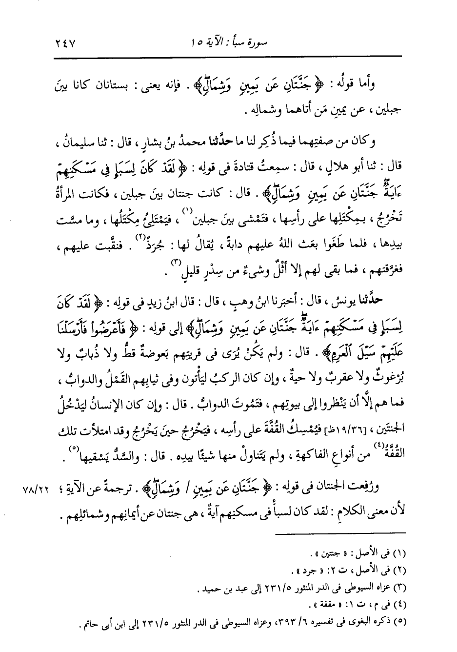 وَكَانَ مِنْ صِنْفِهِمَا فِيمَا ذُكِرَ لَنَا مَا: حَدَّثَنَا مُحَمَّدُ بْنُ بَشَّارٍ، قَالَ: ثنا سُلَيْمَانُ، قَالَ: ثنا أَبُو هِلَالٍ، قَالَ: سَمِعْتُ قَتَادَةَ، فِي قَوْلِهِ: {§لَقَدْ كَانَ لِسَبَإٍ فِي مَسْكَنِهِمْ آيَةٌ جَنَّتَانِ عَنْ يَمِينٍ وَشِمَالٍ} [سبأ: 15] قَالَ: «كَانَتْ جَنَّتَانِ بَيْنَ جَبَلَيْنِ، فَكَانَتِ الْمَرْأَةُ تَخْرُجُ، مِكْتَلُهَا عَلَى رَأْسِهَا، فَتَمْشِي بَيْنَ جَبَلَيْنِ، فَيَمْتَلِئُ مِكْتَلُهَا، وَمَا مَسَّتْ بِيَدِهَا، فَلَمَّا طَغَوْا بَعَثَ اللَّهُ عَلَيْهِمْ دَابَّةٌ، يُقَالُ لَهَا» جُرَذٌ «، فَنَقَّبَتْ عَلَيْهِمْ، فَغَرَّقَتْهُمْ، فَمَا بَقِيَ لَهُمْ إِلَّا أَثْلٌ، وَشَيْءٌ مِنْ سِدْرٍ قَلِيلٌ»