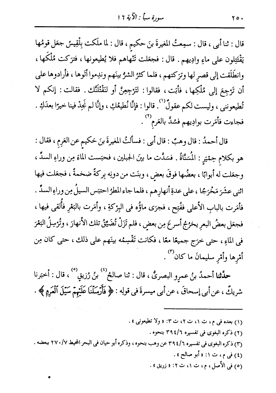 قَالَ: ثنا أَبِي، قَالَ: سَمِعْتُ الْمُغِيرَةَ بْنَ حَكِيمٍ، قَالَ: " §لَمَّا مَلَكَتْ بَلْقِيسُ، جَعَلَ قَوْمُهَا يَقْتَتِلُونَ عَلَى مَاءِ وَادِيهِمْ؛ قَالَ: فَجَعَلَتْ تَنْهَاهُمْ فَلَا يُطِيعُونَهَا فَتَرَكَتْ مُلْكَهَا، وَانْطَلَقَتْ إِلَى قَصْرٍ لَهَا، وَتَرَكَتْهُمْ؛ فَلَمَّا كَثُرَ الشَّرُّ بَيْنَهُمْ، وَنَدِمُوا أَتَوْهَا، فَأَرَادُوهَا عَلَى أَنْ تَرْجِعَ إِلَى مُلْكِهَا، فَأَبَتْ، فَقَالُوا: لَتَرْجِعِنَّ أَوْ لَنَقْتُلَنَّكِ، فَقَالَتْ: إِنَّكُمْ لَا تُطِيعُونَنِي، وَلَيْسَتْ لَكُمْ عُقُولٌ، وَلَا تُطِيعُونِي، قَالُوا: فَإِنَّا نُطِيعُكِ، وَإِنَّا لَمْ نَجِدْ فِينَا خَيْرًا بَعْدَكِ، فَجَاءَتْ فَأَمَرَتْ بِوَادِيهِمْ، فَسُدِّ بِالْعَرِمِ " قَالَ أَحْمَدُ، قَالَ وَهْبٌ، قَالَ أَبِي: فَسَأَلْتُ الْمُغِيرَةَ بْنَ حَكِيمٍ عَنِ الْعَرِمِ، فَقَالَ: هُوَ بِكَلَامِ حِمْيَرَ الْمُسَنَّاةُ؛ فَسَدَتْ مَا بَيْنَ الْجَبَلَيْنِ، فَحَبَسَتِ الْمَاءَ مِنْ وَرَاءِ السَّدِّ، وَجَعَلَتْ لَهُ أَبْوَابًا بَعْضُهَا فَوْقَ بَعْضٍ، وَبَنَتْ مِنْ دُونِهِ بِرْكَةً ضَخْمَةً، فَجَعَلَتْ فِيهَا أَثْنَى عَشَرَ مَخْرَجًا عَلَى عِدَّةِ أَنْهَارِهِمْ؛ فَلَمَّا جَاءَ الْمَطَرُ احْتَبَسَ السَّيْلُ مِنْ وَرَاءِ السَّدِّ، فَأَمَرَتْ بِالْبَابِ الْأَعْلَى فَفُتِحَ، فَجَرَى مَاؤُهُ فِي الْبِرْكَةِ، وَأَمَرَتْ بِالْبَعْرِ فَأُلْقِيَ فِيهَا، فَجَعَلَ بَعْضُ الْبَعْرِ يَخْرُجُ أَسْرَعَ مِنْ بَعْضٍ، فَلَمْ تَزَلْ تُضَيِّقُ تِلْكَ الْأَنْهَارَ، وَتُرْسِلُ الْبَعْرَ فِي الْمَاءِ، حَتَّى خَرَجَ جَمِيعًا مَعًا، فَكَانَتْ تَقْسِمُهُ بَيْنَهُمْ عَلَى ذَلِكَ، حَتَّى كَانَ مِنْ شَأْنِهَا وَشَأْنِ سُلَيْمَانَ مَا كَانَ