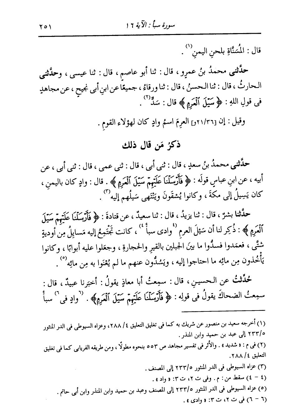 حَدَّثَنَا بِشْرٌ، قَالَ: ثنا يَزِيدُ، قَالَ: ثنا سَعِيدٌ، عَنْ قَتَادَةَ {§فَأَرْسَلْنَا عَلَيْهِمْ سَيْلَ الْعَرِمِ} [سبأ: 16] «ذَكَرَ لَنَا أَنَّ سَيْلَ الْعَرِمِ وَادٍ كَانَتْ تَجْتَمِعُ إِلَيْهِ مَسَايِلُ مِنْ أَوْدِيَةٍ شَتَّى، فَعَمَدُوا فَسَدُّوا مَا بَيْنَ الْجَبَلَيْنِ بِالْقِيرِ وَالْحِجَارَةِ، وَجَعَلُوا عَلَيْهِ أَبْوَابًا، وَكَانُوا يَأْخُذُونَ مِنْ مَائِهِ مَا احْتَاجُوا إِلَيْهِ، وَيسُدُّونَ عَنْهُمْ مَا لَمْ يَعْنُوا بِهِ مِنْ مَائِهِ شَيْئًا»