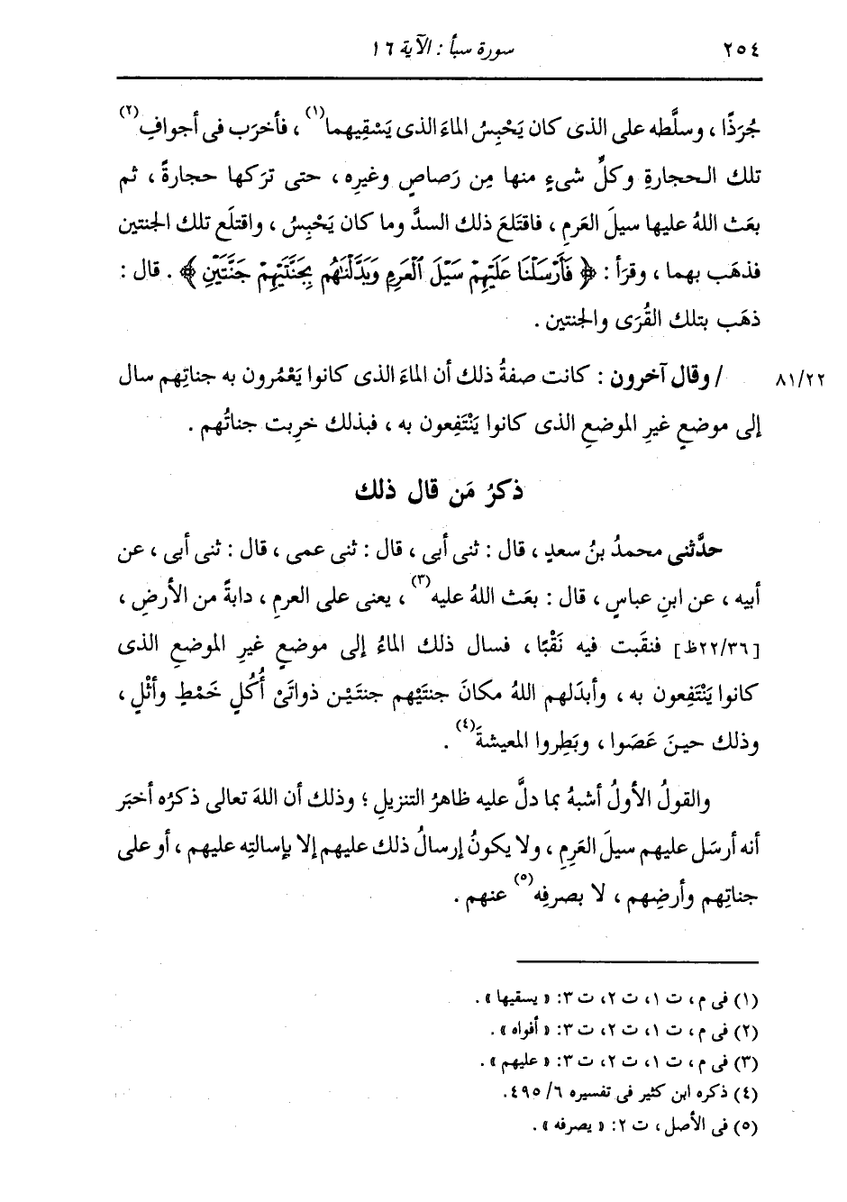 ذِكْرُ مَنْ قَالَ ذَلِكَ: حَدَّثَنِي مُحَمَّدُ بْنُ سَعْدٍ، قَالَ: ثني أَبِي، قَالَ: ثني عَمِّي، قَالَ: ثني أَبِي، عَنْ أَبِيهِ، عَنِ ابْنِ عَبَّاسٍ، قَالَ: «§بَعَثَ اللَّهُ عَلَيْهِمْ يَعْنِي عَلَى الْعَرِمِ دَابَّةً مِنَ الْأَرْضِ، فَثَقَبَتْ فِيهِ ثَقْبًا، فَسَالَ ذَلِكَ الْمَاءُ إِلَى مَوْضِعٍ غَيْرِ الْمَوْضِعِ الَّذِي كَانُوا يَنْتَفِعُونَ بِهِ، وَأَبْدَلَهُمُ اللَّهُ مَكَانَ جَنَّتَيْهِمْ جَنَّتَيْنِ ذَوَاتَيْ أُكُلٍ خَمْطٍ، وَذَلِكَ حِينَ عَصَوْا، وَبَطَرُوا الْمَعِيشَةَ» وَالْقَوْلُ الْأَوَّلُ أَشْبَهُ بِمَا دَلَّ عَلَيْهِ ظَاهَرُ التَّنْزِيلِ، وَذَلِكَ أَنَّ اللَّهَ تَعَالَى ذِكْرُهُ أَخْبَرَ أَنَّهُ أَرْسَلَ عَلَيْهِمْ سَيْلَ الْعَرِمِ، وَلَا يَكُونُ إِرْسَالُ ذَلِكَ عَلَيْهِمْ إِلَّا بِإِسَالَتِهِ عَلَيْهِمْ، أَوْ عَلَى جَنَّاتِهِمْ وَأَرْضِهِمْ، لَا بِصَرْفِهِ عَنْهُمْ
