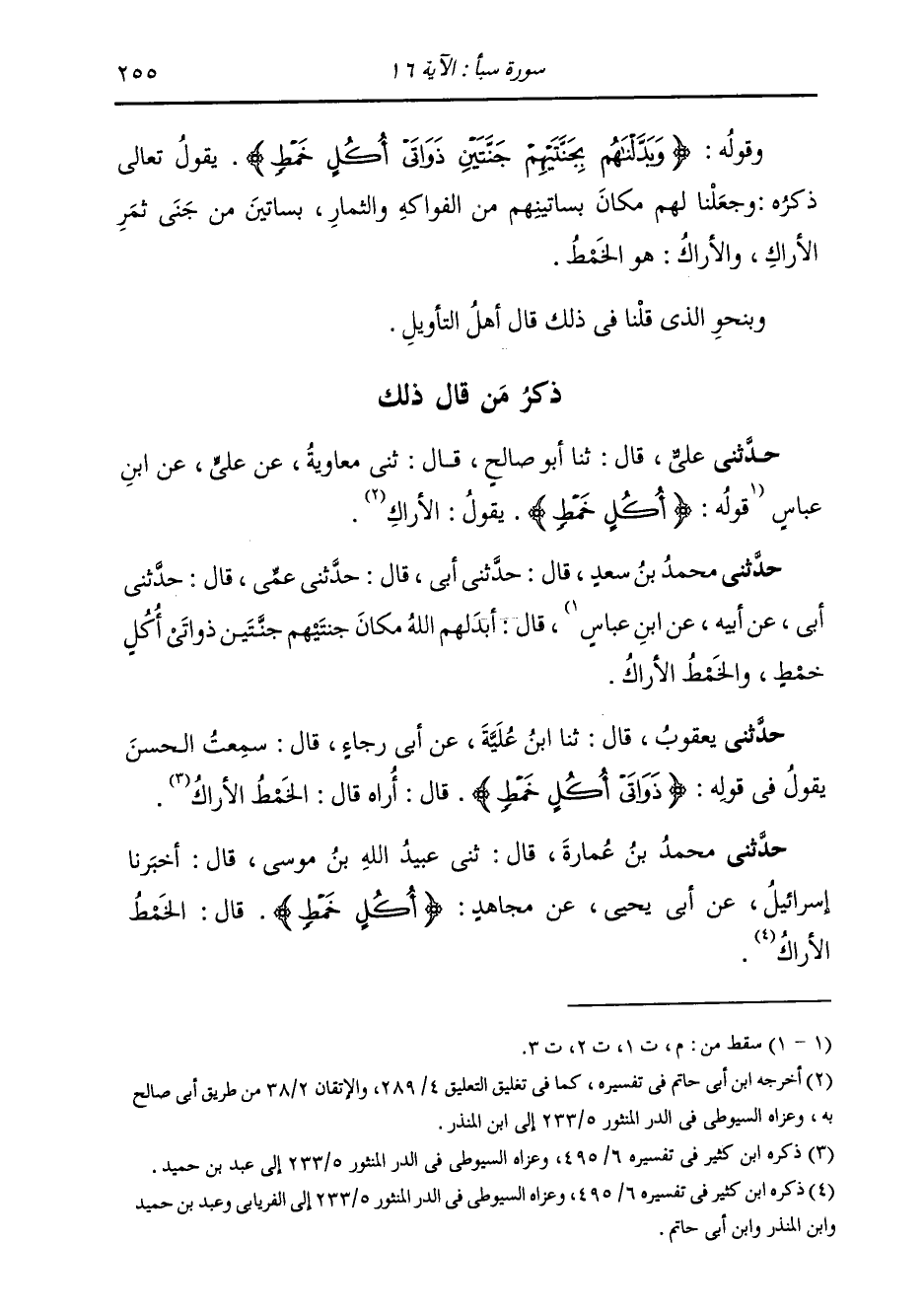 ذِكْرُ مَنْ قَالَ ذَلِكَ: حَدَّثَنِي عَلِيٌّ، قَالَ: ثنا أَبُو صَالِحٍ، قَالَ: ثني مُعَاوِيَةُ، عَنْ عَلِيٍّ، عَنِ ابْنِ عَبَّاسٍ، قَالَ: " §أَبْدَلَهُمُ اللَّهُ مَكَانَ جَنَّتَيْهِمْ جَنَّتَيْنِ ذَوَاتَيْ أُكُلٍ خَمْطٍ، وَالْخَمْطُ: الْأَرَاكُ "