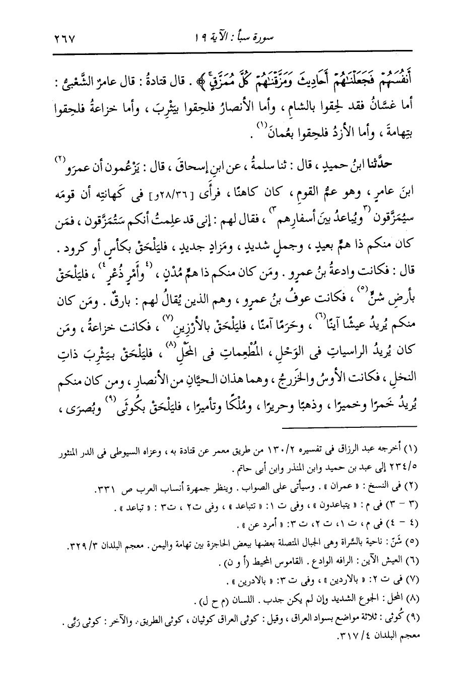 حَدَّثَنَا ابْنُ حُمَيْدٍ، قَالَ: ثنا سَلَمَةُ، عَنِ ابْنِ إِسْحَاقَ، قَالَ: " يَزْعُمُونَ أَنَّ عِمْرَانَ بْنَ عَامِرٍ، وَهُوَ عَمُّ الْقَوْمِ كَانَ كَاهِنًا §فَرَأَى فِي كَهَانَتِهِ أَنَّ قَوْمَهُ سَيُمَزَّقُونَ وَيَتَبَاعَدُونَ، فَقَالَ لَهُمْ: إِنِّي قَدْ عَلِمْتُ أَنَّكُمْ سَتُمَزَّقُونَ، فَمَنْ كَانَ مِنْكُمْ ذَا هَمٍّ بَعِيدٍ، وَجَمَلٍ شَدِيدٍ، وَمَزَادٍ جَدِيدٍ، فَلْيَلْحَقْ بِكَأْسٍ أَوْ كَرُودٍ، قَالَ: فَكَانَتْ وَادِعَةُ بْنُ عَمْرٍو؛ وَمَنْ كَانَ مِنْكُمْ ذَا هَمٍّ مُدْنٍ، وَأَمْرَدٍ عَنٍ، فَلْيَلْحَقْ بِأَرْضٍ شَنَّ، فَكَانَتْ عَوْفُ بْنُ عَمْرٍو، وَهُمُ الَّذِينَ يُقَالُ لَهُمْ بَارِقٌ؛ وَمَنْ كَانَ مِنْكُمْ يُرِيدُ عَيْشًا آيِنًا، وَحَرَمًا آمِنًا، فَلْيَلْحَقْ بِالْأَرْزَيْنِ، فَكَانَتْ خُزَاعَةُ؛ وَمَنْ كَانَ يُرِيدُ الرَّاسِيَاتِ فِي الْوَحْلِ، الْمُطْعِمَاتِ فِي الْمُحِلِّ، فَلْيَلْحَقْ بِيَثْرِبَ ذَاتِ النَّخْلِ، فَكَانَتِ الْأَوْسُ وَالْخَزْرَجُ فَهُمَا هَذَانِ الْحَيَّانِ مِنَ الْأَنْصَارِ؛ وَمَنْ كَانَ يُرِيدُ خَمْرًا وَخَمِيرًا، وَذَهَبًا وَحَرِيرًا، وَمُلْكًا وَتَأْمِيرًا فَلْيَلْحَقْ بِكُوثَى وَبُصْرَى،