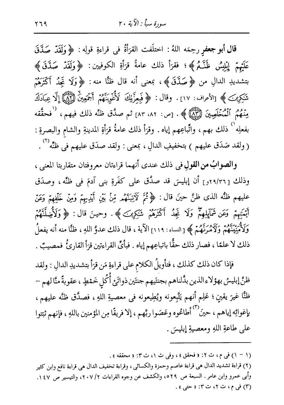 اخْتَلَفَتِ الْقُرَّاءُ فِي قِرَاءَةِ قَوْلِهِ: {وَلَقَدْ صَدَّقَ عَلَيْهِمْ إِبْلِيسُ ظَنَّهُ} [سبأ: 20] فَقَرَأَ ذَلِكَ عَامَّةُ قُرَّاءِ الْكُوفِيِّينَ: {وَلَقَدْ صَدَّقَ} [سبأ: 20] بِتَشْدِيدِ الدَّالِ مِنْ صَدَّقَ، بِمَعْنَى أَنَّهُ قَالَ ظَنًّا مِنْهُ: {وَلَا تَجِدُ أَكْثَرَهُمْ شَاكِرِينَ} [الأعراف: 17] ، وَقَالَ: {فَبِعِزَّتِكَ لَأَغْوِيَنَّهُمْ أَجْمَعِينَ إِلَّا عِبَادَكَ مِنْهُمُ الْمُخْلَصِينَ} [ص: 83] ، ثُمَّ صَدَّقَ ظَنَّهُ ذَلِكَ فِيهِمْ، فَحَقَّقَ ذَلِكَ بِهِمْ، وَبِاتِّبَاعِهِمْ إِيَّاهُ وَقَرَأَ ذَلِكَ عَامَّةُ قُرَّاءِ الْمَدِينَةِ وَالشَّامِ وَالْبَصْرَةِ (وَلَقَدْ صَدَقَ) بِتَخْفِيفِ الدَّالِ، بِمَعْنَى: وَلَقَدْ صَدَقَ عَلَيْهِمْ ظَنُّهُ وَالصَّوَابُ مِنَ الْقَوْلِ فِي ذَلِكَ عِنْدِي أَنَّهُمَا قِرَاءَتَانِ مَعْرُوفَتَانِ مُتَقَارِبَتَا الْمَعْنَى؛ وَذَلِكَ أَنَّ إِبْلِيسَ قَدْ صَدَّقَ عَلَى كُفْرِهِ بَنِي آدَمَ فِي ظَنِّهِ، وَصَدَقَ عَلَيْهِمْ ظَنُّهُ الَّذِي ظَنَّ حِينَ قَالَ: {ثُمَّ لَآتِيَنَّهُمْ مِنْ بَيْنِ أَيْدِيهِمْ وَمَنْ خَلْفِهِمْ وَعَنْ أَيْمَانِهِمْ وَعَنْ شَمَائِلِهِمْ وَلَا تَجِدُ أَكْثَرَهُمْ شَاكِرِينَ} [الأعراف: 17] ، وَحِينَ قَالَ: {وَلَأُضِلِّنَّهُمْ وَلَأُمَنِّيَنَّهُمْ} [النساء: 119] الْآيَةَ، قَالَ ذَلِكَ عَدُوُّ اللَّهِ، ظَنًّا مِنْهُ أَنَّهُ يَفْعَلُ ذَلِكَ لَا عِلْمًا، فَصَارَ ذَلِكَ حَقًّا بِاتِّبَاعِهِمْ إِيَّاهُ، فَبِأَيٍّ الْقِرَاءَتَيْنِ قَرَأَ الْقَارِئُ فَمُصِيبٌ فَإِذَا كَانَ ذَلِكَ كَذَلِكَ، فَتَأْوِيلُ الْكَلَامِ عَلَى قِرَاءَةِ مَنْ قَرَأَ بِتَشْدِيدِ الدَّالِ: وَلَقَدْ ظَنَّ إِبْلِيسُ بِهَؤُلَاءِ الَّذِينَ بَدَّلْنَاهُمْ بِجَنَّتَيْهِمْ جَنَّتَيْنِ ذَوَاتَيْ أُكُلٍ خَمْطٍ، عُقُوبَةً مِنَّا لَهُمْ، ظَنًّا غَيْرَ يَقِينٍ، عَلِمَ أَنَّهُمْ يَتَّبِعُونَهُ وَيُطِيعُونَهُ فِي مَعْصِيَةِ اللَّهِ، فَصَدَقَ ظَنُّهُ عَلَيْهِمْ، بِإِغْوَائِهِ إِيَّاهُمْ، حَتَّى أَطَاعُوهُ، وَعَصَوْا رَبَّهُمْ، إِلَّا فَرِيقًا مِنَ الْمُؤْمِنِينَ بِاللَّهِ، فَإِنَّهُمْ ثَبَتُوا عَلَى طَاعَةِ اللَّهِ وَمَعْصِيَةِ إِبْلِيسَ