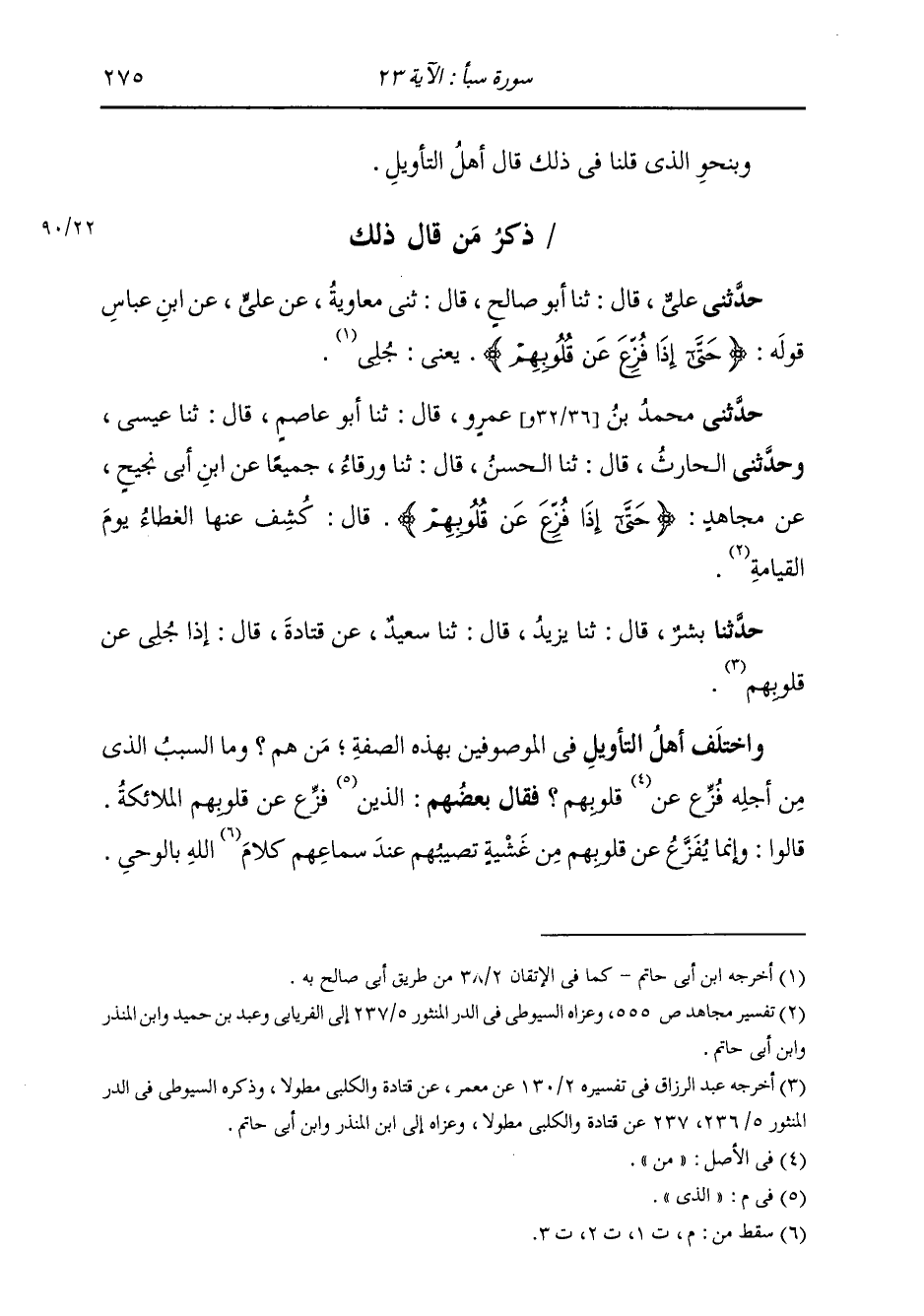 حَدَّثَنَا بِشْرٌ، قَالَ: ثنا يَزِيدُ، قَالَ: ثنا سَعِيدٌ، عَنْ قَتَادَةَ، قَالَ: «§إِذَا جُلِّيَ عَنْ قُلُوبِهِمْ» وَاخْتَلَفَ أَهْلُ التَّأْوِيلِ فِي الْمَوْصُوفِينَ بِهَذِهِ الصِّفَةِ مَنْ هُمْ؟ وَمَا السَّبَبُ الَّذِي مِنْ أَجَلِهِ فُزِّعَ عَنْ قُلُوبِهِمْ؟ فَقَالَ بَعْضُهُمُ: الَّذِي فُزِّعَ عَنْ قُلُوبِهِمُ الْمَلَائِكَةُ، قَالُوا: وَإِنَّمَا يَفْزَعُ عَنْ قُلُوبِهِمْ مِنْ غَشِيَّةٍ تُصِيبُهُمْ عِنْدَ سَمَاعِهِمُ اللَّهَ بِالْوَحْي